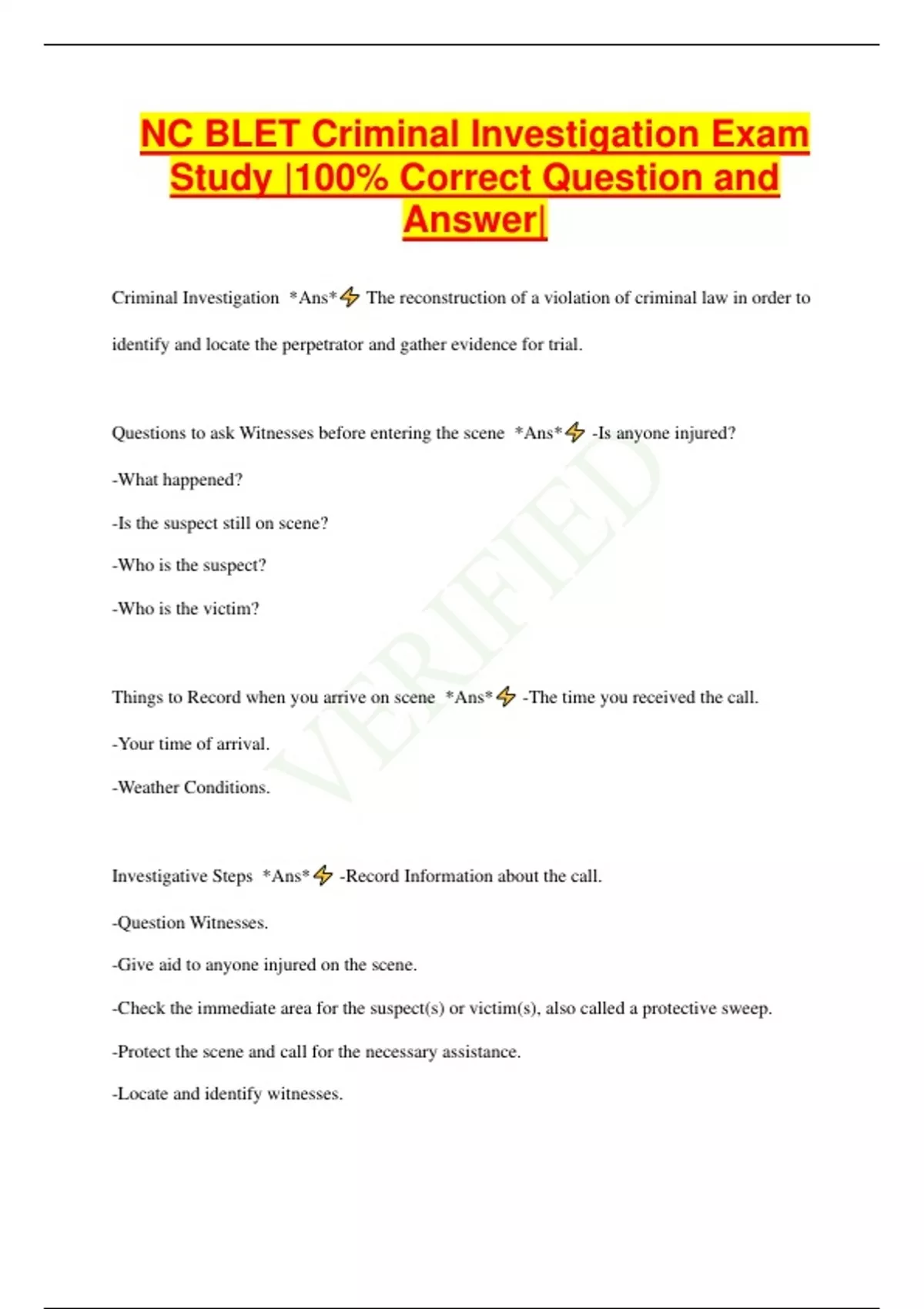 NC BLET Criminal Investigation Exam Study |100% Correct Question and Answer| Criminal Investigation *Ans* The reconstruction of a violation of criminal law in order to identify and locate the perpetrator and gather evidence for trial. Questions to ask Witnesses before entering the scene *Ans* -Is anyone injured? -What happened? -Is the suspect still on scene? -Who is the suspect? -Who is the victim? Things to Record when you arrive on scene *Ans* -The time you received the call. -Your time of arrival. -Weather Conditions. Investigative Steps *Ans* -Record Information about the call. -Question Witnesses. -Give aid to anyone injured on the scene. -Check the immediate area for the suspect(s) or victim(s), also called a protective sweep. -Protect the scene and call for the necessary assistance. -Locate and identify witnesses. -Broadcast any lookouts or necessary information. -When the requested assistance arrives , secure the scene more adequately. -After entry has been lawfully made, whether by exigent circumstances , search warrant, or consent, the investigating officer should carefully walk thru the scene. -Photograph,measure, and sketch the scene including all items of evidence. -Collect, label, and package evidence. -If necessary, secure the scene until some follow up investigation is done. Two Reasons for Preservation of the Crime Scene *Ans* -To prevent the destruction or removal of physical evidence AND -To allow for accurate reconstruction of the events occurring at the scene. Preservation starts by removing____________________________________________ from the area. *Ans* Unauthorized Persons Methods for securing the crime scene area *Ans* -Posting additional officers at entrance. -Roping off the involved area. -Placings signs on doors. -Positioning barricades to block streets. -Using traffic cones or flares to block areas or provide a guide for direction of travel. -Using patrol vehicles to block streets or a specific area. Seven Areas Common to most Crime Scenes *Ans* -Place of arrival -Point of entry -Path through the scene -Contact with the scene -Contact with the victim -Place of exit -Place of arrest Whenever possible, all evidence should be __________________until photographed and measured for the sketch. *Ans* Unmoved If anything is touched or moved- *Ans* -the officer must document that in their report and obtain elimination fingerprints and DNA from the party that moved or touched the item. Ways to Locate and Identify Potential Witnesses *Ans* -Conduct an area canvass to locate those that live or work near the crime scene. -Observe the individuals that are talking amongst themselves while others are listening. -Interview friends, relatives, and associates of victim. -Interview those named during the interviews with the above people. -Check your local department records division for associates to the victim and/or suspect. -Locate photographs found at the scene or in the victims possession, of possible associates. -Locate the victims address or phone book. -Seize surveillance film from the location of the crime and/or area surrounding b