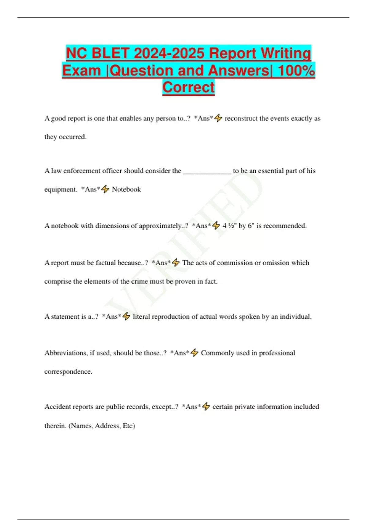 NC BLET Report Writing Exam |Question and Answers| 100% Correct A good report is one that enables any person to..? *Ans* reconstruct the events exactly as they occurred. A law enforcement officer should consider the _____________ to be an essential part of his equipment. *Ans* Notebook A notebook with dimensions of approximately..? *Ans* 4 ½" by 6" is recommended. A report must be factual because..? *Ans* The acts of commission or omission which comprise the elements of the crime must be proven in fact. A statement is a..? *Ans* literal reproduction of actual words spoken by an individual. Abbreviations, if used, should be those..? *Ans* Commonly used in professional correspondence. Accident reports are public records, except..? *Ans* certain private information included therein. (Names, Address, Etc) Always give the weather at the time the incident occurred. The codes for weather are? *Ans* CL - Clear F - Fair O - Overcast R - Rain Sn - Snow Sl - Sleet H - Hail I - Ice Another definition for public record is..? *Ans* "in connection with the transaction of public business by any agency of North Carolina government or its subdivisions." As a general rule, records of _____________ and records of ______________________ information are not public records. However, some information is subject to public disclosure. *Ans* Criminal Investigations and Criminal Intelligence As of 2016, the North Carolina legislature passed a law mandating that recordings from bodyworn cameras, dashboard cameras, custodial interview, etc. are..? *Ans* not public records. These recordings must be released by court order.