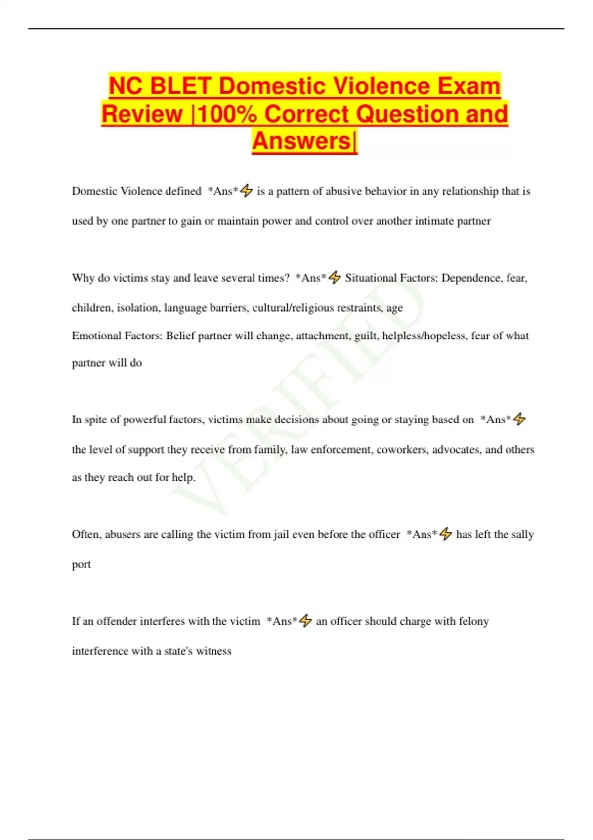 NC BLET Domestic Violence Exam Review |100% Correct Question and Answers| Domestic Violence defined *Ans* is a pattern of abusive behavior in any relationship that is used by one partner to gain or maintain power and control over another intimate partner Why do victims stay and leave several times? *Ans* Situational Factors: Dependence, fear, children, isolation, language barriers, cultural/religious restraints, age Emotional Factors: Belief partner will change, attachment, guilt, helpless/hopeless, fear of what partner will do In spite of powerful factors, victims make decisions about going or staying based on *Ans* the level of support they receive from family, law enforcement, coworkers, advocates, and others as they reach out for help. Often, abusers are calling the victim from jail even before the officer *Ans* has left the sally port If an offender interferes with the victim *Ans* an officer should charge with felony interference with a state's witness Officer-involved domestic violence *Ans* is estimated to be at least as common as that of the general population Plan of Action for responding to domestic calls include *Ans* Weapons? Safest place to park? How many people involved? Prior violence? Where/how far away is my back-up? Technically speaking, the telecommunicator is *Ans* the first one on the scene Prior to arrival at a domestic, *Ans* attempt to find out from the telecommunicator specific information relative to the call When responding to a domestic, you must make a tactical approach which includes *Ans* don't pass the residence; park your patrol vehicle where it will least likely be seen; don't slam the door; tactical approach on foot. At all points during a domestic call *Ans* you are assessing the situation Time lag between a complaint and when the first officer arrives *Ans* is 5-10 minutes, and the disturbance continues, often intensifying, sometimes resulting in a shooting before the first officer arrives.