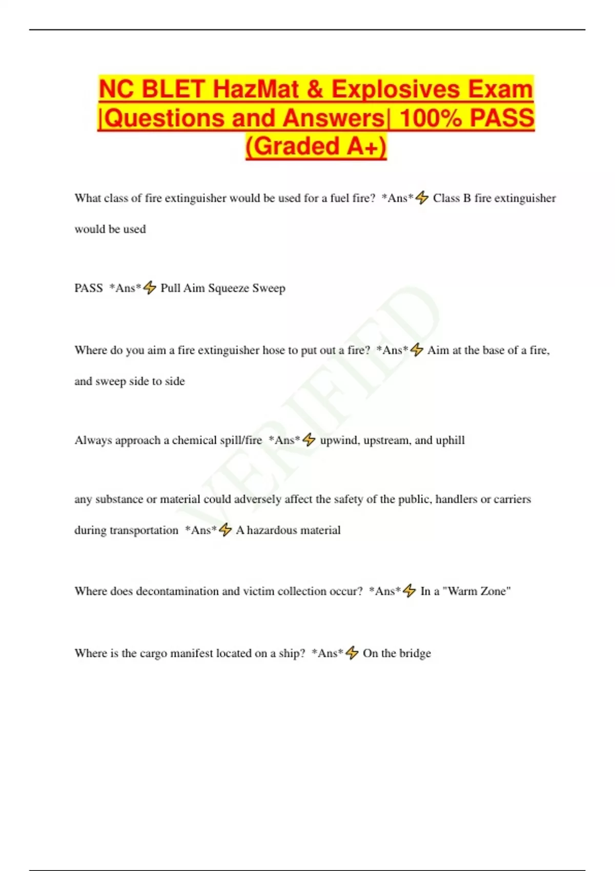 NC BLET HazMat & Explosives Exam |Questions and Answers| 100% PASS (Graded A+) What class of fire extinguisher would be used for a fuel fire? *Ans* Class B fire extinguisher would be used PASS *Ans* Pull Aim Squeeze Sweep Where do you aim a fire extinguisher hose to put out a fire? *Ans* Aim at the base of a fire, and sweep side to side Always approach a chemical spill/fire *Ans* upwind, upstream, and uphill any substance or material could adversely affect the safety of the public, handlers or carriers during transportation *Ans* A hazardous material Where does decontamination and victim collection occur? *Ans* In a "Warm Zone" Where is the cargo manifest located on a ship? *Ans* On the bridge What is useful for LEOs to carry for reference in regards to identifying possible hazardous materials? *Ans* The Emergency Response Guidebook 5 Steps of Awareness for first responders concerning hazardous material incidents *Ans* 1. Detection 2. Recognition 3. Identify 4. Notify 5. Call for resources TRACEM *Ans* Thermal, Radiological, Asphyxiation, Chemical, Etiological, Mechanical (hazardous material types) In reference to a bomb threat in a building, how should the search be performed? *Ans* Exterior to interior IF you are unable to identify a hazardous material, which number should be referenced in the ERG? *Ans* 111 B-NICE *Ans* Biological, Nuclear, Incendiary, Chemical, Explosive