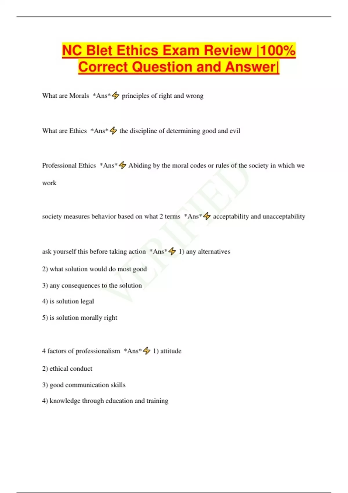 NC Blet Ethics Exam Review |100% Correct Question and Answer| What are Morals *Ans* principles of right and wrong What are Ethics *Ans* the discipline of determining good and evil Professional Ethics *Ans* Abiding by the moral codes or rules of the society in which we work society measures behavior based on what 2 terms *Ans* acceptability and unacceptability ask yourself this before taking action *Ans* 1) any alternatives 2) what solution would do most good 3) any consequences to the solution 4) is solution legal 5) is solution morally right 4 factors of professionalism *Ans* 1) attitude 2) ethical conduct 3) good communication skills 4) knowledge through education and training what makes a true professional *Ans* Discretion what is duty *Ans* skilled performance, commitment above personal interests, and self sacrifice what is secondary to to a officers duty *Ans* personal interests what makes law enforcement different from most other businesses or professions? *Ans* public trust law enforcement rules of official conduct *Ans* Oaths of office code of ethics canons of ethics & departments written and unwritten policies and procedures how many articles are in the canons of police ethics *Ans*