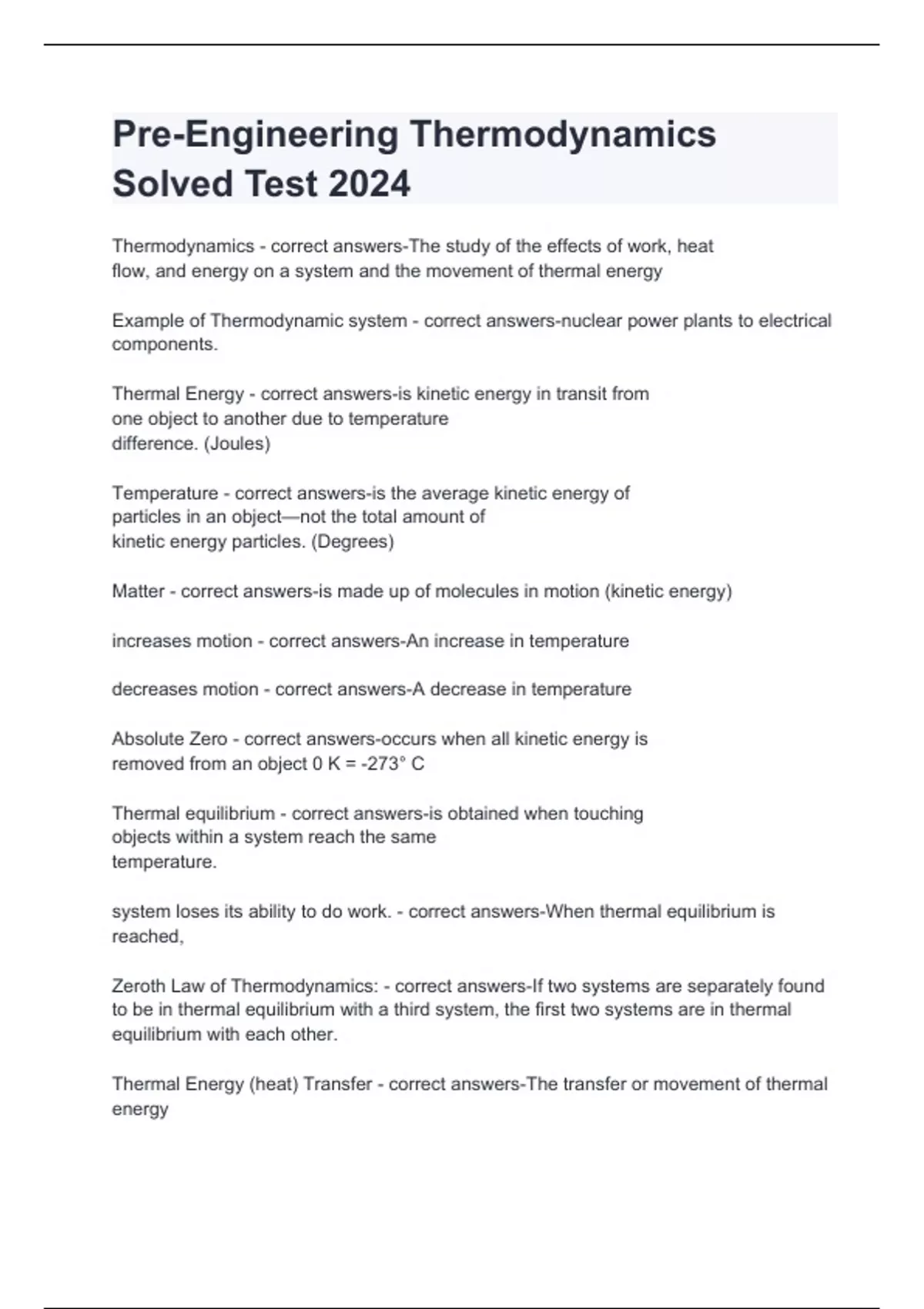 Pre-Engineering Thermodynamics Solved Test 2024