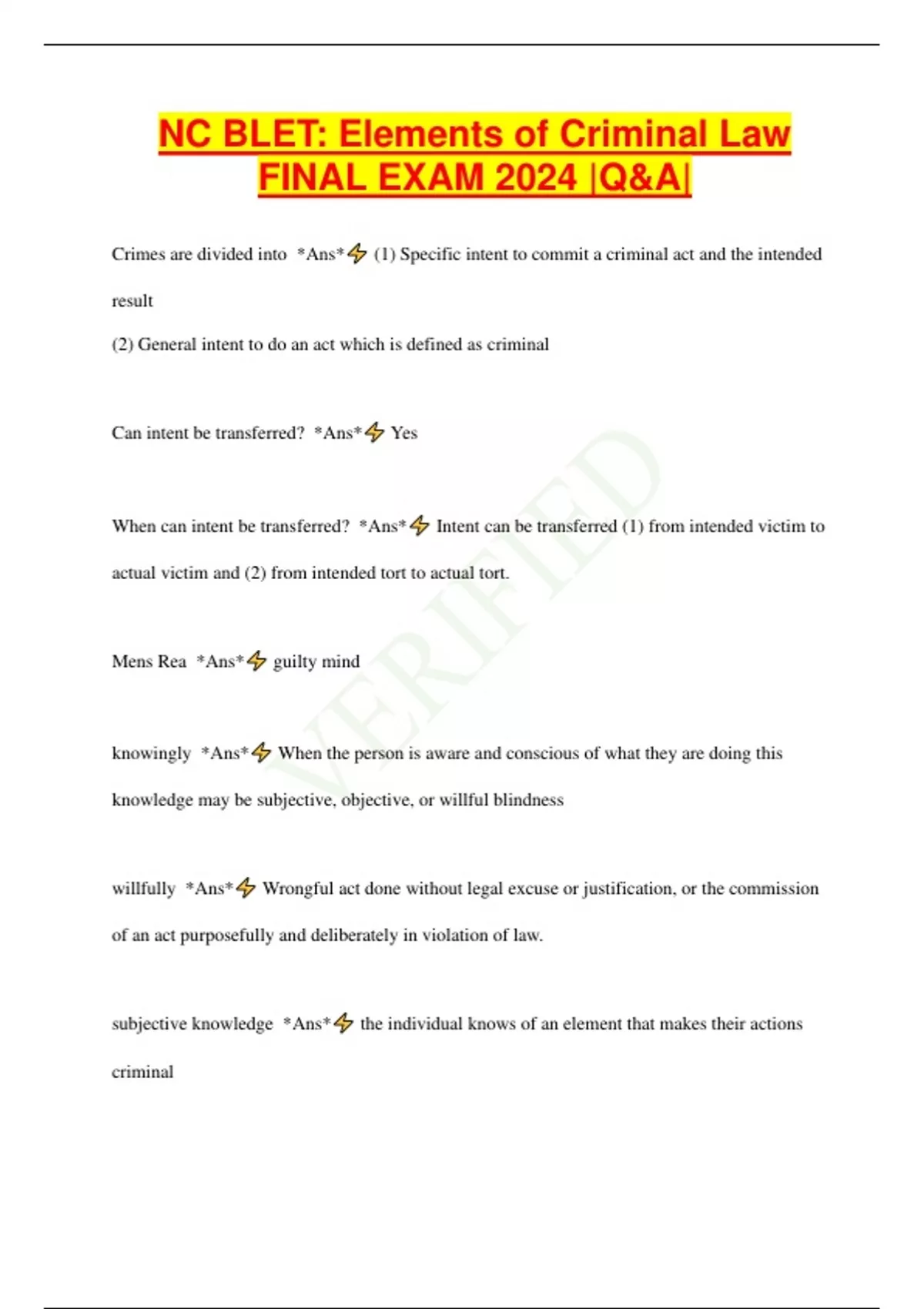 NC BLET: Elements of Criminal Law FINAL EXAM 2024 |Q&A| Crimes are divided into *Ans* (1) Specific intent to commit a criminal act and the intended result (2) General intent to do an act which is defined as criminal Can intent be transferred? *Ans* Yes When can intent be transferred? *Ans* Intent can be transferred (1) from intended victim to actual victim and (2) from intended tort to actual tort. Mens Rea *Ans* guilty mind knowingly *Ans* When the person is aware and conscious of what they are doing this knowledge may be subjective, objective, or willful blindness willfully *Ans* Wrongful act done without legal excuse or justification, or the commission of an act purposefully and deliberately in violation of law. subjective knowledge *Ans* the individual knows of an element that makes their actions criminal objective knowledge *Ans* reasonable person should know what they did was illegal Willful Blindness *Ans* A deliberate closing of one's mind to the possible consequences of one's actions wantonly *Ans* conscious and intentional disregard of or deliberate indifference to the rights and safety of others Maliciously/malice *Ans* intent to commit an unlawful act or the desire to inflict pain or injury to another Malice is often used in cases involving? *Ans* Homicide In NC there are three recognized meanings of malice they are: *Ans* 1. Done with hatred or spite 2. Inherently dangerous to human life 3. Done intentionally without justification Criminal Negligence is also know as? *Ans* Culpable negligence