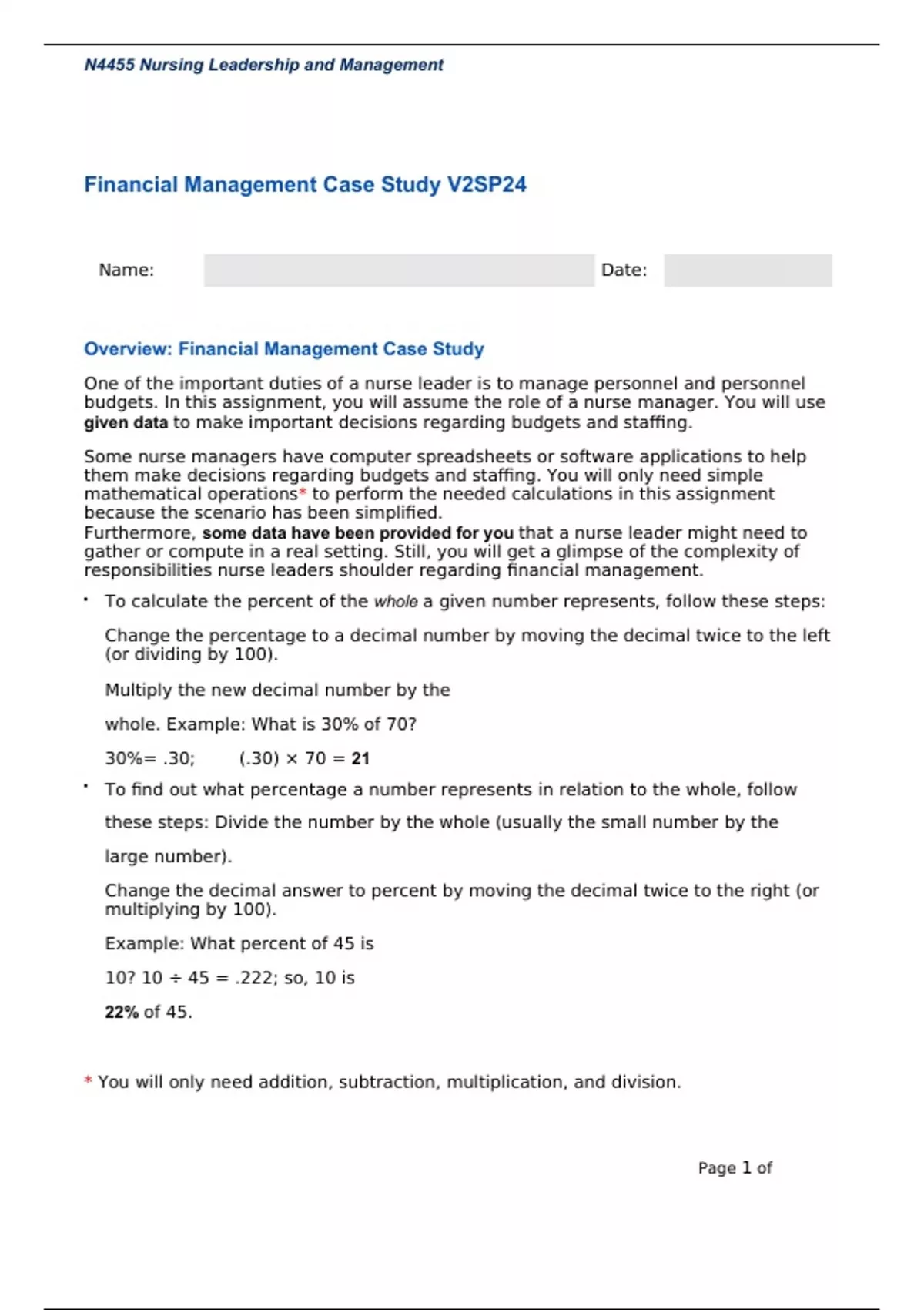 Overview: Financial Management Case Study One of the important duties of a nurse leader is to manage personnel and personnel budgets. In this assignment, you will assume the role of a nurse manager. You will use given data to make important decisions regarding budgets and staffing. Some nurse managers have computer spreadsheets or software applications to help them make decisions regarding budgets and staffing. You will only need simple mathematical operations* to perform the needed calculations in this assignment because the scenario has been simplified. Furthermore, some data have been provided for you that a nurse leader might need to gather or compute in a real setting. Still, you will get a glimpse of the complexity of responsibilities nurse leaders shoulder regarding financial management. • To calculate the percent of the whole a given number represents, follow these steps: Change the percentage to a decimal number by moving the decimal twice to the left (or dividing by 100). Multiply the new decimal number by the whole. Example: What is 30% of 70? 30%= .30; (.30) × 70 = 21