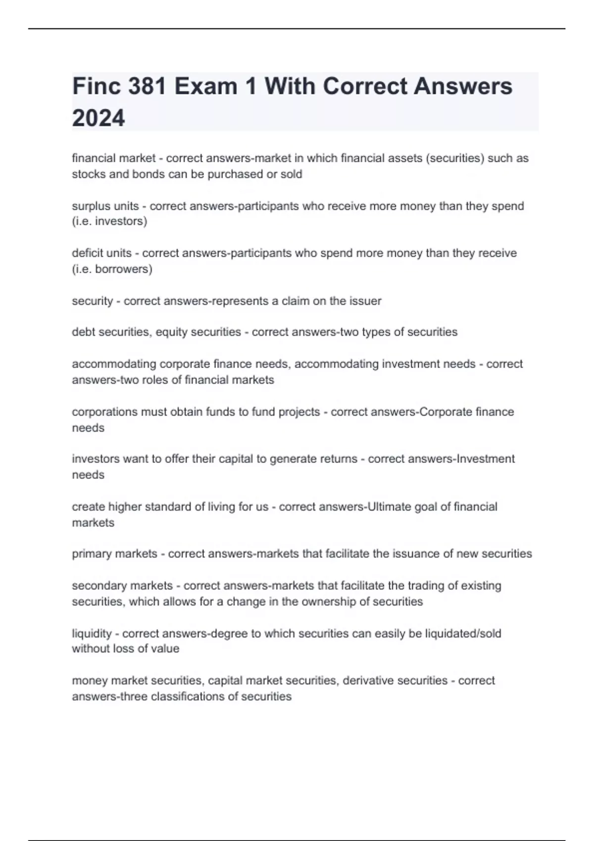 Finc 322 Exam 1 (Ch 1 & 3) With Correct Answer 2024