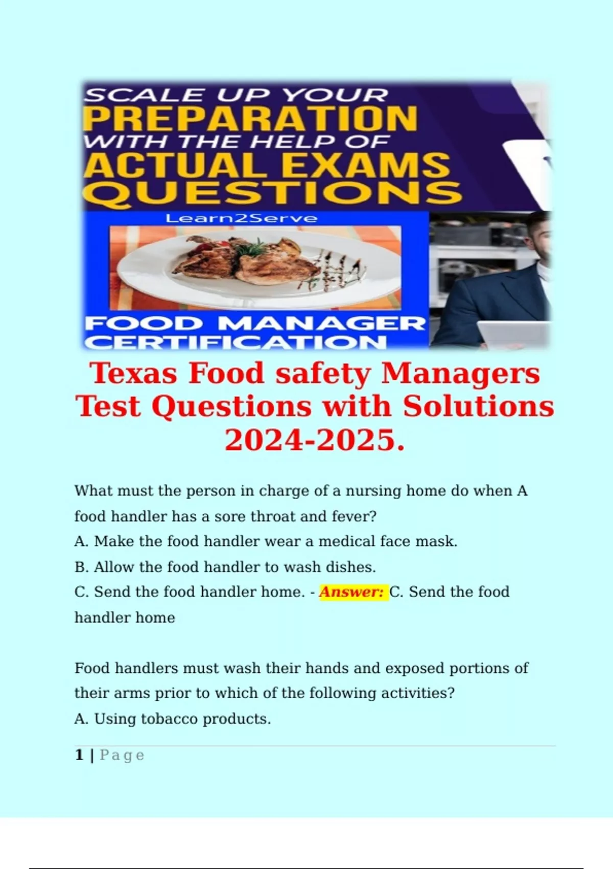 Texas Food safety Managers Test Questions with Solutions . Terms like: What must the person in charge of a nursing home do when A food handler has a sore throat and fever? A. Make the food handler wear a medical face mask. B. Allow the food handler to wash dishes. C. Send the food handler home. - Answer: C. Send the food handler home Food handlers must wash their hands and exposed portions of their arms prior to which of the following activities? A. Using tobacco products. B. Taking a restroom break. C. Putting on disposable gloves. - Answer: C. Putting on disposable gloves.