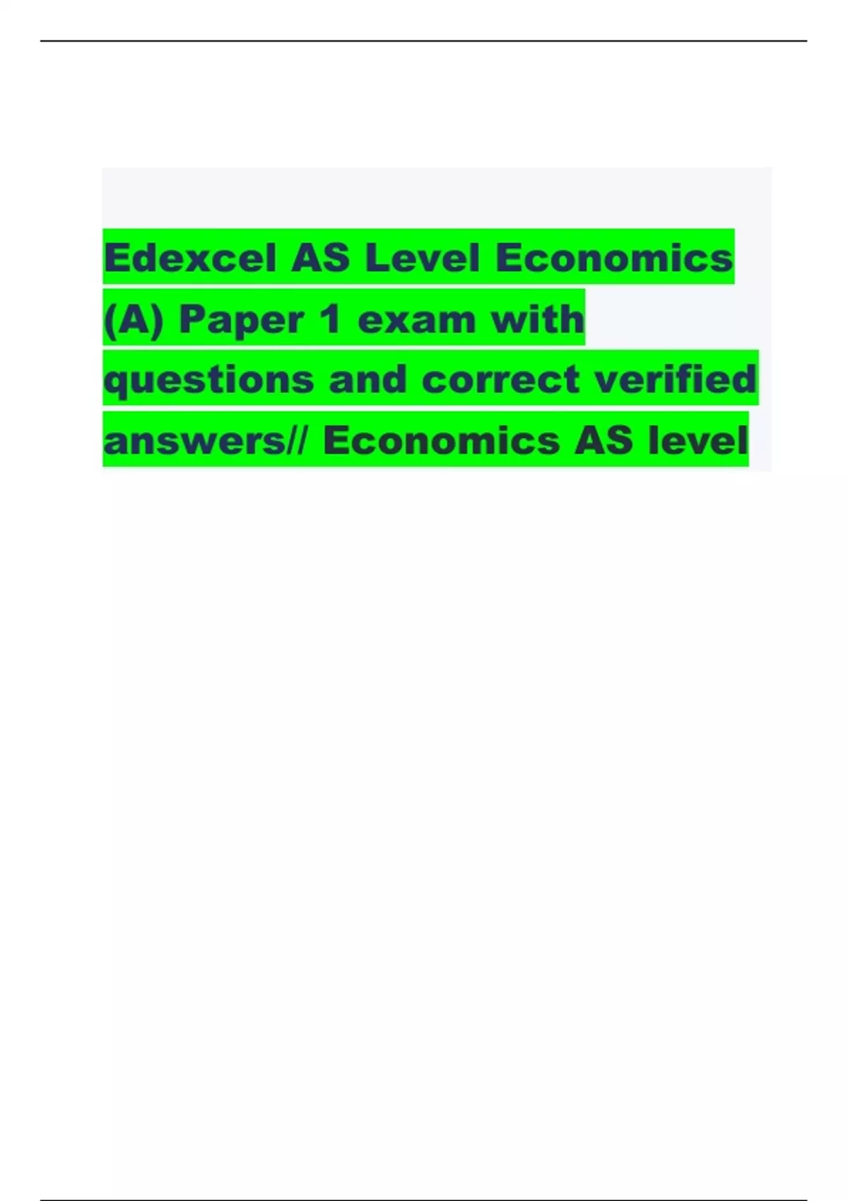 Edexcel AS Level Economics (A) Paper 1 exam with questions and correct verified answers// Economics AS level What are the 6 characteristics of money? (PUDDLE) - CORRECT ANSW-*Portability* - Portability is that money must be able to go wherever such that it is easy to transport as people travel. *Uniformity/can't be counterfeited* - Uniformity of money calls for a standardization of money so that it looks the same and can't be faked of counterfeited *Durability* - Durability of money is such that it can be used over and over again; hence it must survive wear and tear for long periods. *Divisibility* - Money must be easily divided into smaller denominations to enable a person to buy different products. *Limited supply/valuable* - Money must be available only in limited quantities to maintain its value *(Easily) Acceptible* - Everyone must be able to accept money in exchange for goods or services What are the four factors of production? - CORRECT ANSW-'Land' - all natural resources including oil, fish, soil, forests. The reward for land is rent.