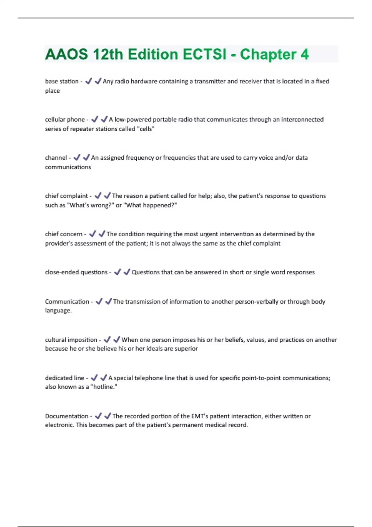 base station - Any radio hardware containing a transmitter and receiver that is located in a fixed place cellular phone - A low-powered portable radio that communicates through an interconnected series of repeater stations called "cells" channel - An assigned frequency or frequencies that are used to carry voice and/or data communications chief complaint - The reason a patient called for help; also, the patient's response to questions such as "What's wrong?" or "What happened?" chief concern - The condition requiring the most urgent intervention as determined by the provider's assessment of the patient; it is not always the same as the chief complaint close-ended questions - Questions that can be answered in short or single word responses Communication - The transmission of information to another person-verbally or through body language. cultural imposition - When one person imposes his or her beliefs, values, and practices on another because he or she believe his or her ideals are superior dedicated line - A special telephone line that is used for specific point-to-point communications; also known as a "hotline." Documentation - The recorded portion of the EMT's patient interaction, either written or electronic. This becomes part of the patient's permanent medical x - The ability to transmit and receive simultaneously. emotional intelligence - The ability to understand and manage one's own emotions and properly respond to the emotions of others Ethnocentrism - When a person considers his or her own cultural values as more important when interacting with people of a different culture. Federal Communications Commission (FCC) - The federal agency that has jurisdiction over interstate and international telephone and telegraph services and satellite communications, all of which may involve EMS activity. handover - The transfer of pertinent patient information and the responsibility for the patient's care; often involves the physical movement of the patient and associated equipment; also known as handoff. Health Information Exchange (HIE) - A system that allows EMS providers to access relevant health data (eg, past medical problems, medications, allergies, end-of-life decisions), avoid unnecessary duplication of effort in data entry, and view patient outcomes related to hospital care. interoperable communications system - A communication system that uses voice-over-Internetprotocol (VoIP) technology to allow multiple agencies to communicate and transmit data. MED channels - VHF and UHF channels that the Federal Communications Commission has designated exclusively for EMS use. Mental model - The picture an individual has in his or her head of "what's going on" in a given situation. Mission-critical communications - Any communications where disruption will result in the failure of the mission at e data terminal (MDT) - A small computer terminal inside the ambulance that directly receives data from the dispatch center.