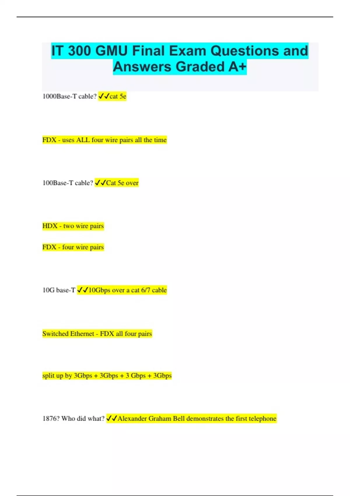 IT 300 GMU Final Exam Questions and Answers Graded A+ 1000Base-T cable? cat 5e FDX - uses ALL four wire pairs all the time 100Base-T cable? Cat 5e over HDX - two wire pairs FDX - four wire pairs 10G base-T 10Gbps over a cat 6/7 cable Switched Ethernet - FDX all four pairs split up by 3Gbps + 3Gbps + 3 Gbps + 3Gbps 1876? Who did what? Alexander Graham Bell demonstrates the first telephone 1885? AT&T makes a long distance telephone network 1913? The Kingsbury Agreement - AT&T agrees to stop by other telcos and Wilson drops anti-trust proceedings - Seen as a regulated monopoly from 1968? Carterfone decision removed many restrictions to force others to use AT&T 1G characteristics? Analog signal AMPS, TACS, NBT 3G characteristics? Voice quality like PSTN support for all switched networks supported alot of equipment 4G Characteristics? All IP packet switched network smooth handover at different networks even over 3G and 2G 802.15 WPAN? Wireless personal Area Network