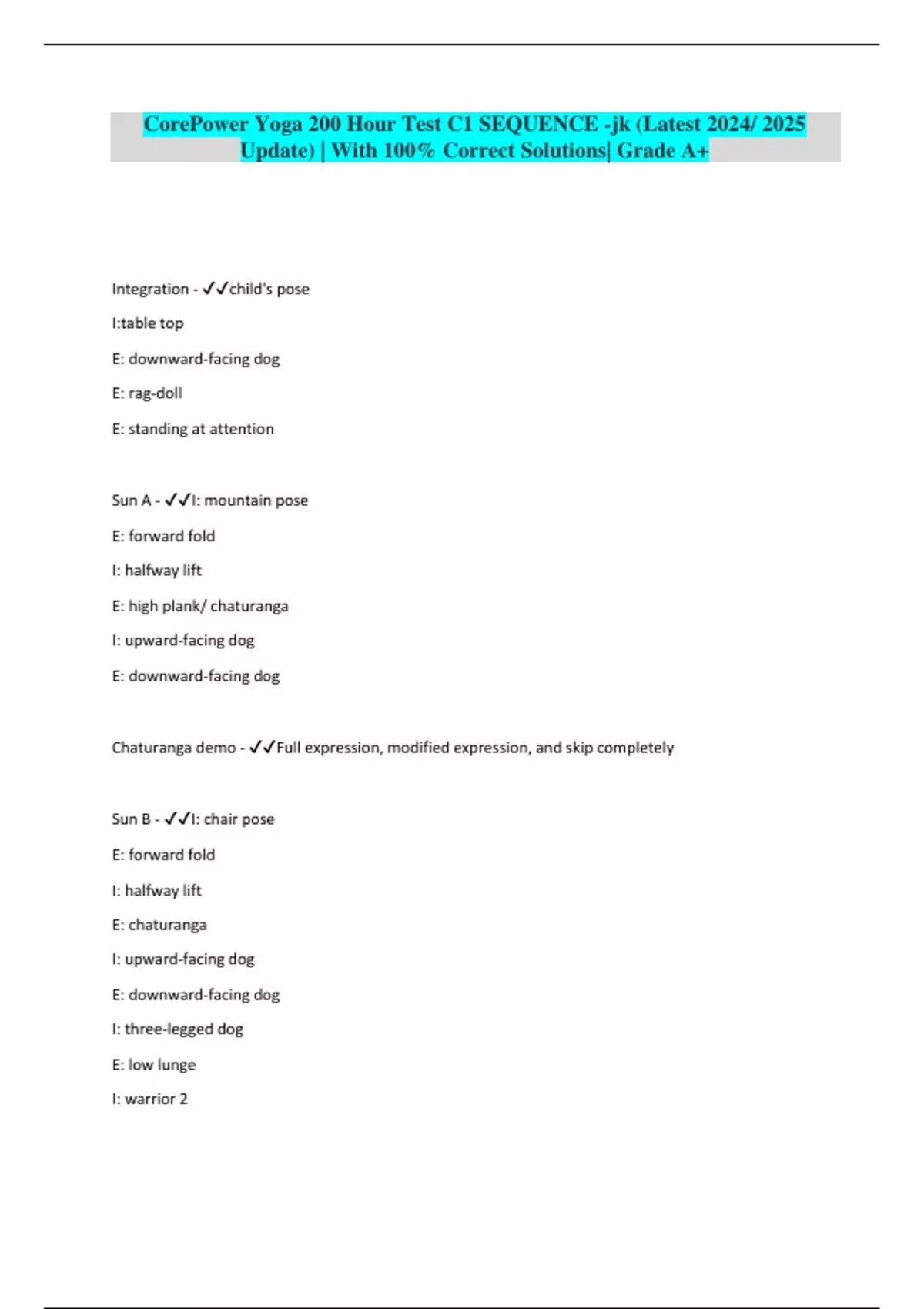CorePower Yoga 200 Hour Test C1 SEQUENCE -jk (Latest 2024/ 2025 Update) | With 100% Correct Solutions| Grade A+