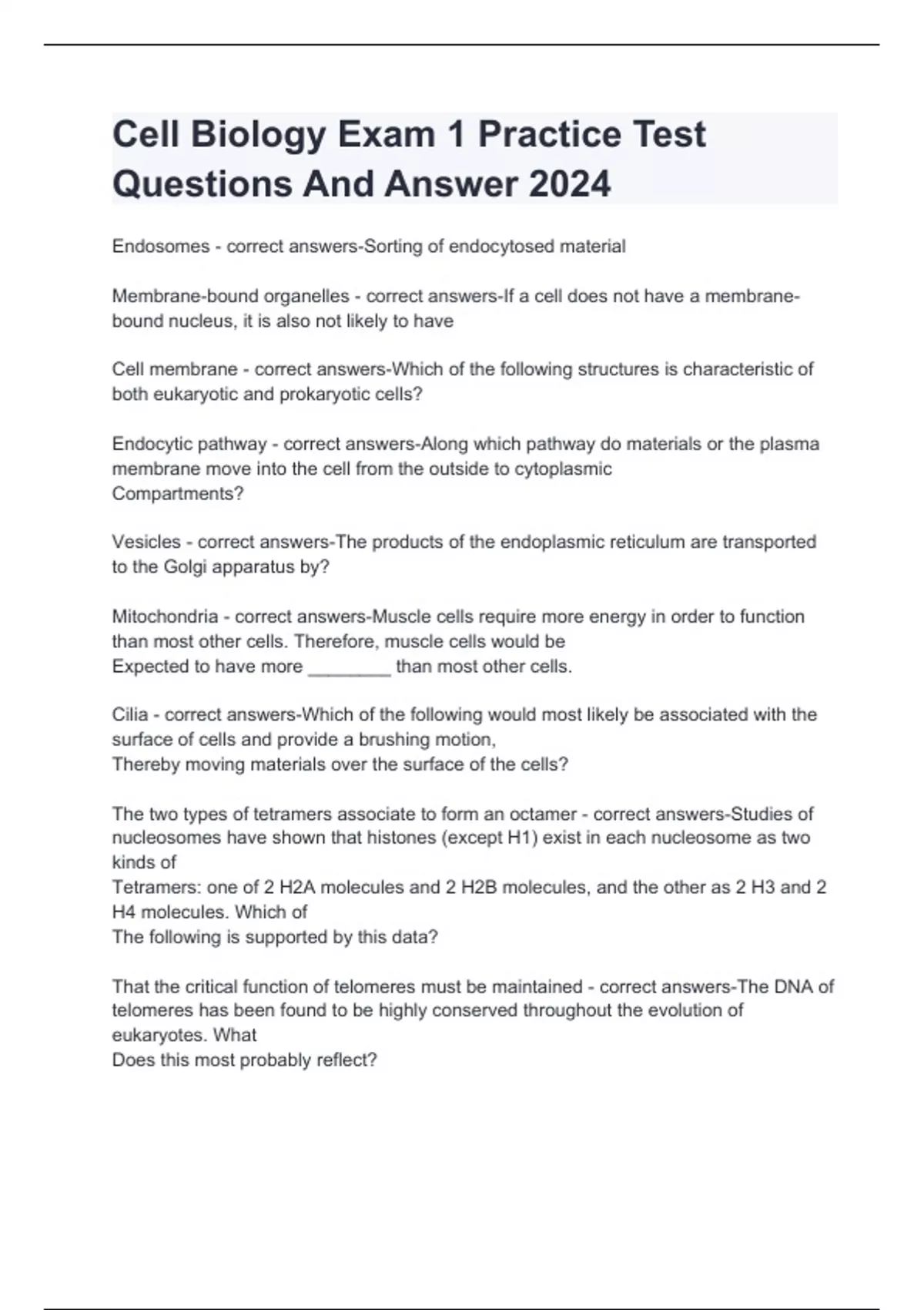 Cell Biology Exam 1 Practice Test Questions And Answer 2024
