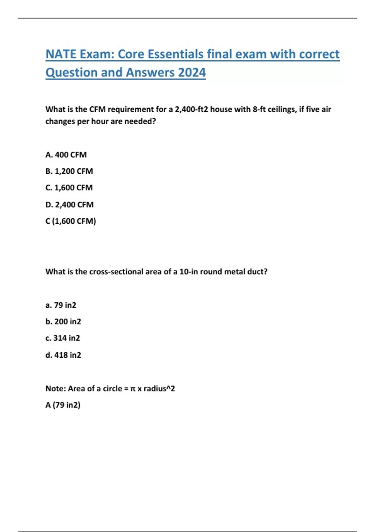 NATE Exam: Core Essentials final exam with correct Question and Answers 2024 What is the CFM requirement for a 2,400-ft2 house with 8-ft ceilings, if five air changes per hour are needed? A. 400 CFM B. 1,200 CFM C. 1,600 CFM D. 2,400 CFM C (1,600 CFM) What is the cross-sectional area of a 10-in round metal duct? a. 79 in2 b. 200 in2 c. 314 in2 d. 418 in2 Note: Area of a circle = π x radius^2 A (79 in2) How fast does air with a velocity pressure of 0.20 in. wig. move through a round duct? A. 400 ft. /min B. 1,200 ft. /min C. 1,600 ft. /min D. 1,800 ft. /min Note: Velocity = 4005 x (the square root of velocity pressure) D (1,800 ft. /min) How fast does air with a velocity pressure of 0.20 in w.g. move through a square duct? A. 400 ft. /min B. 1,200 ft. /min C. 1,600 ft. /min D. 1,800 ft. /min Note: Velocity = 4005 x (the square root of velocity pressure) D (1,800 ft. /min) Customers depend on you to be ____. A. honest B. loyal C. patient D. all of the above D (all of the above: honest, loyal, patient) Before leaving a service call, you should be sure to ____. A. ask the customer for referrals B. collect payment in cash if possible C. demonstrate system operation and describe basic maintenance procedures to the customer D. try to sell the customer an equipment upgrade C (demonstrate system operation and describe basic maintenance procedures to the customer) What is the advantage of using a tube cutter to cut copper pipe? a. It can cut hard or soft drawn copper b. It leaves no metal shavings to contaminate the system c. It produces a clean, square cut d. All of the above D (All of the above: it can cut hard or soft drawn copper; it leaves no metal shavings to contaminate the system; it produces a clean,