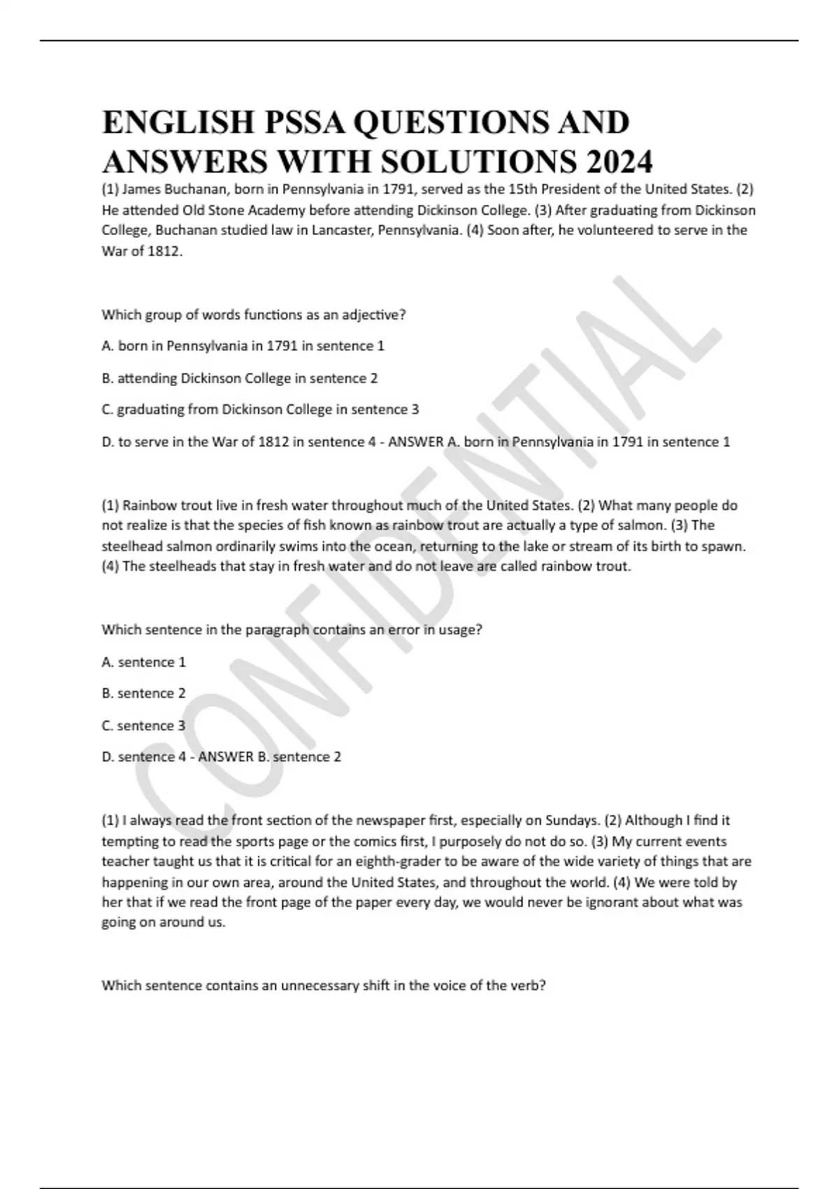 english pssa questions and answers with solutions