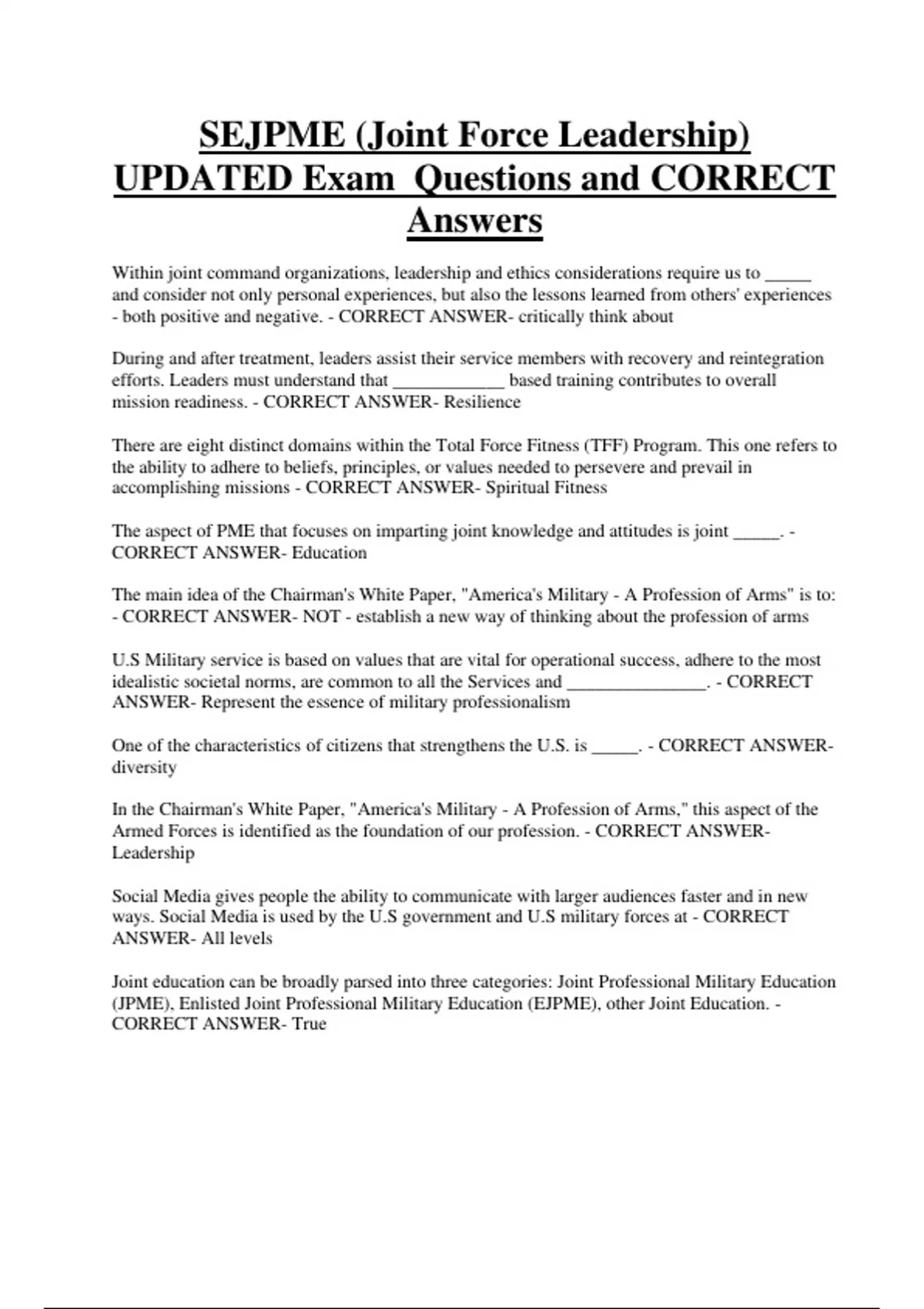 SEJPME (Joint Force Leadership) UPDATED Exam Questions and CORRECT Answers Within joint command organizations, leadership and ethics considerations require us to _____ and consider not only personal experiences, but also the lessons learned from others' experiences - both positive and negative. - CORRECT ANSWER- critically think about During and after treatment, leaders assist their service members with recovery and reintegration efforts. Leaders must understand that ____________ based training contributes to overall mission readiness. - CORRECT ANSWER- Resilience There are eight distinct domains within the Total Force Fitness (TFF) Program. This one refers to the ability to adhere to beliefs, principles, or values needed to persevere and prevail in accomplishing missions - CORRECT ANSWER- Spiritual Fitness