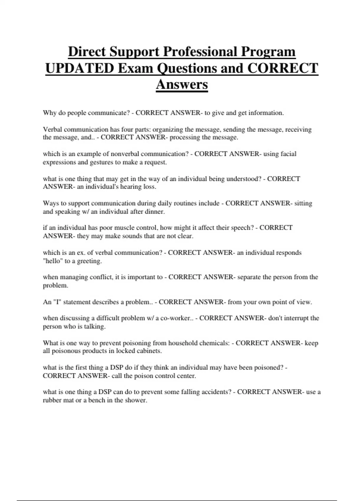 Direct Support Professional Program UPDATED Exam Questions and CORRECT Answers Why do people communicate? - CORRECT ANSWER- to give and get information. Verbal communication has four parts: organizing the message, sending the message, receiving the message, and.. - CORRECT ANSWER- processing the message. which is an example of nonverbal communication? - CORRECT ANSWER- using facial expressions and gestures to make a request.
