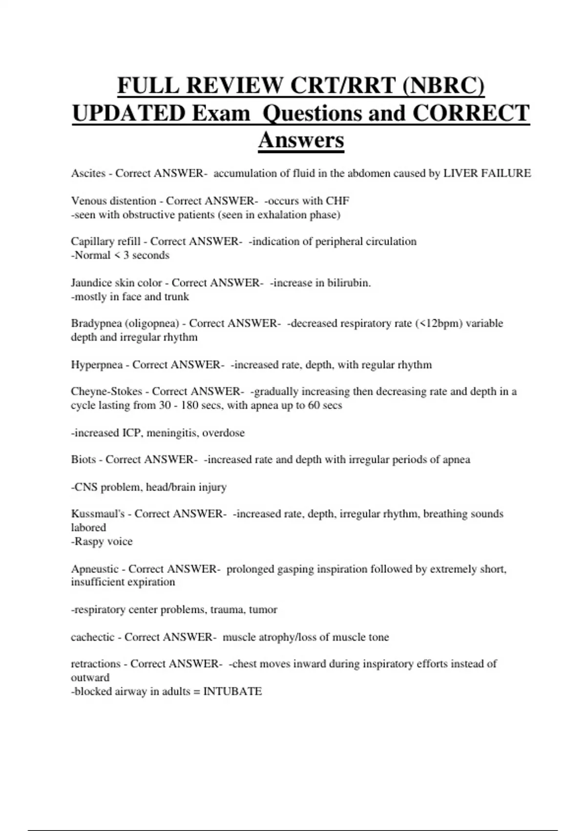 FULL REVIEW CRT/RRT (NBRC) UPDATED Exam Questions and CORRECT Answers Ascites - Correct ANSWER- accumulation of fluid in the abdomen caused by LIVER FAILURE Venous distention - Correct ANSWER- -occurs with CHF -seen with obstructive patients (seen in exhalation phase) Capillary refill - Correct ANSWER- -indication of peripheral circulation -Normal < 3 seconds Jaundice skin color - Correct ANSWER- -increase in bilirubin. -mostly in face and trunk Bradypnea (oligopnea) - Correct ANSWER- -decreased respiratory rate (<12bpm) variable depth and irregular rhythm