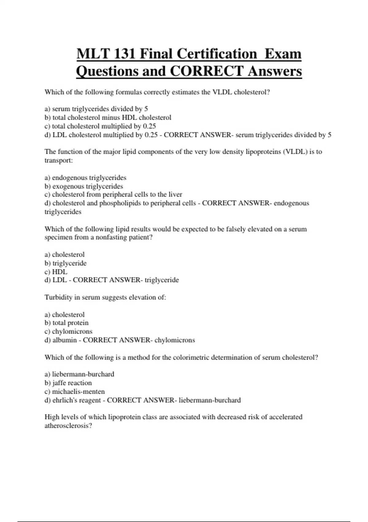 MLT 131 Final Certification Exam Questions and CORRECT Answers Which of the following formulas correctly estimates the VLDL cholesterol? a) serum triglycerides divided by 5 b) total cholesterol minus HDL cholesterol c) total cholesterol multiplied by 0.25 d) LDL cholesterol multiplied by 0.25 - CORRECT ANSWER- serum triglycerides divided by 5 The function of the major lipid components of the very low density lipoproteins (VLDL) is to transport: a) endogenous triglycerides b) exogenous triglycerides c) cholesterol from peripheral cells to the liver d) cholesterol and phospholipids to peripheral cells - CORRECT ANSWER- endogenous triglycerides