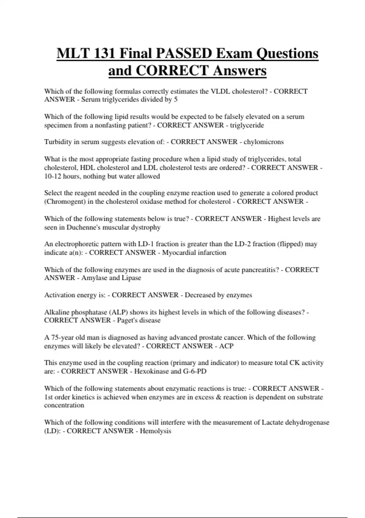 MLT 131 Final PASSED Exam Questions and CORRECT Answers Which of the following formulas correctly estimates the VLDL cholesterol? - CORRECT ANSWER - Serum triglycerides divided by 5 Which of the following lipid results would be expected to be falsely elevated on a serum specimen from a nonfasting patient? - CORRECT ANSWER - triglyceride Turbidity in serum suggests elevation of: - CORRECT ANSWER - chylomicrons