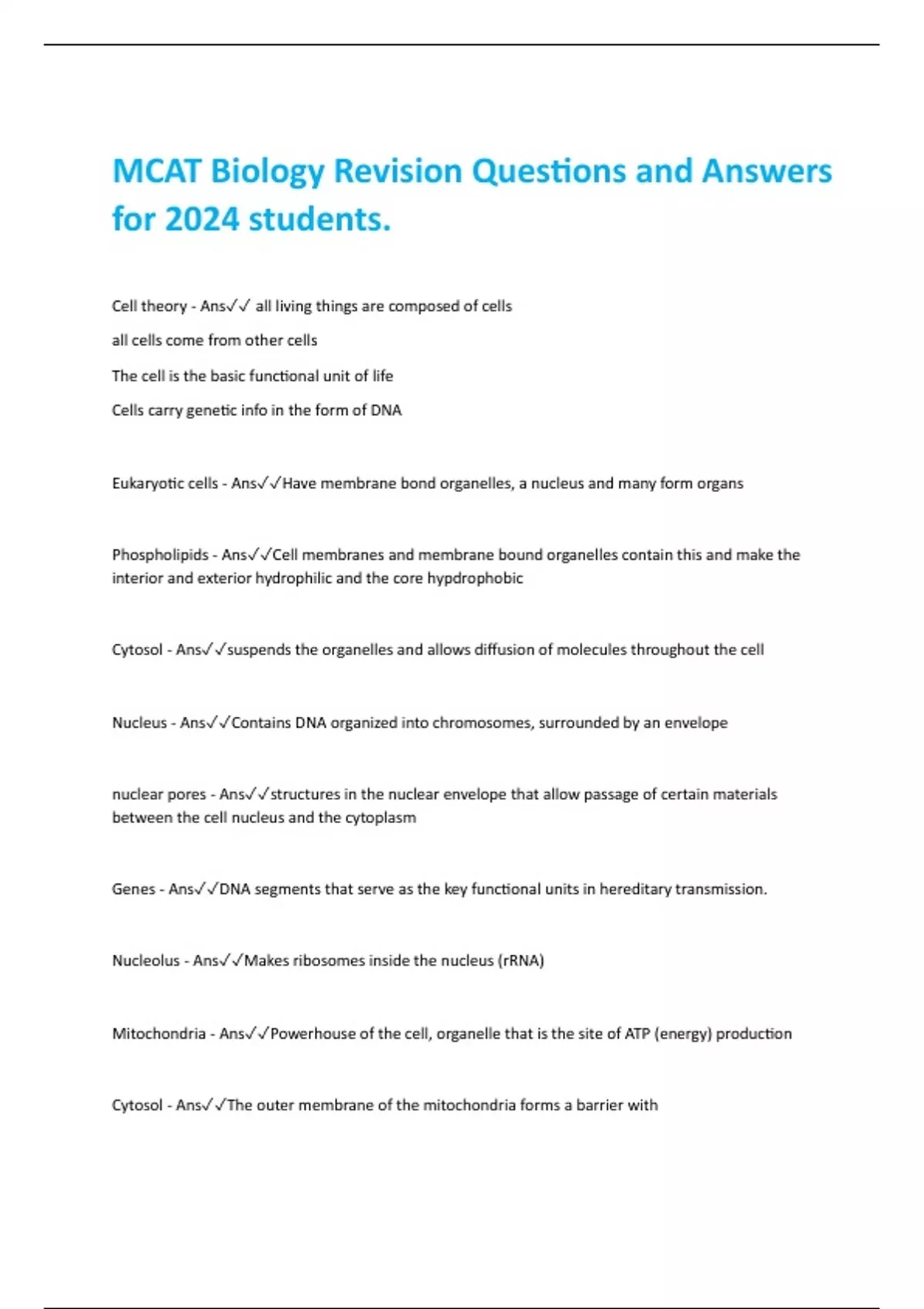 MCAT Biology Revision Questions and Answers for 2024 students.