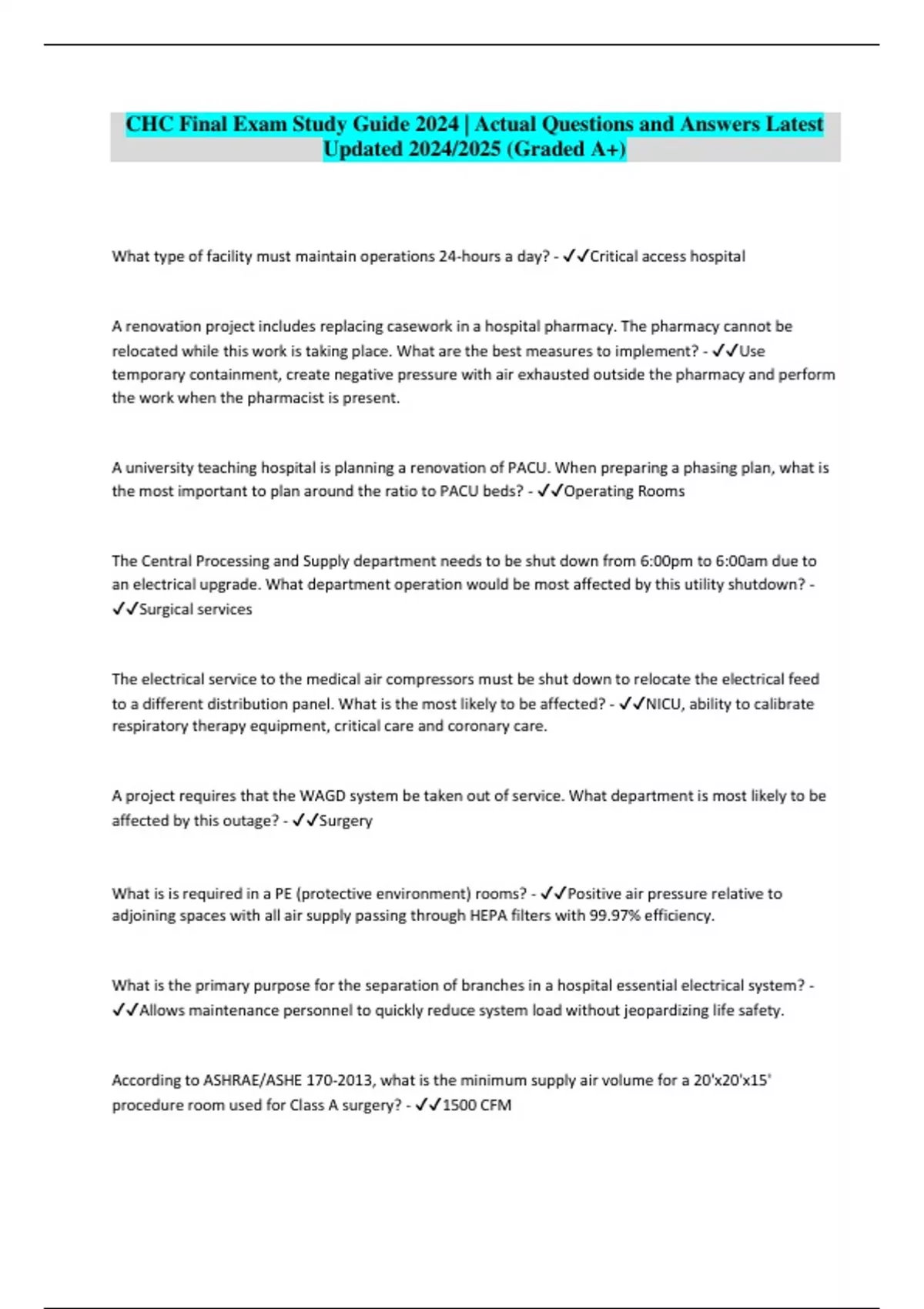CHC Final Exam Study Guide 2024 | Actual Questions and Answers Latest Updated 2024/2025 (Graded A+)