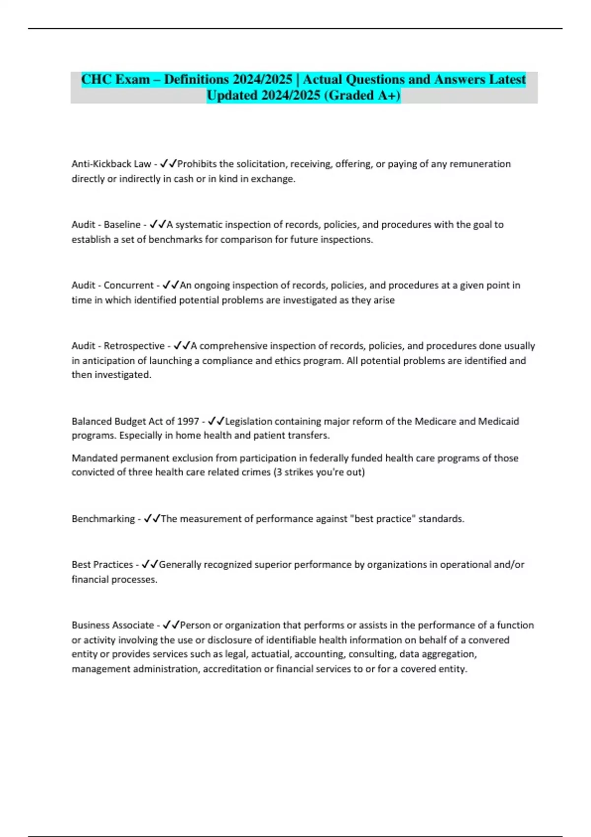 CHC Exam – Definitions 2024/2025 | Actual Questions and Answers Latest Updated 2024/2025 (Graded A+)