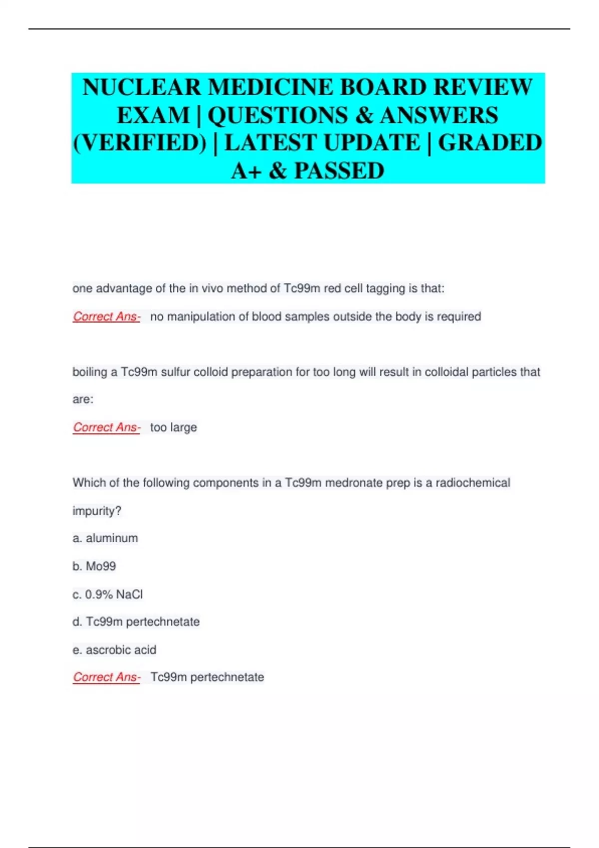 NUCLEAR MEDICINE BOARD REVIEW EXAM | QUESTIONS & ANSWERS (VERIFIED) | LATEST UPDATE | GRADED A+ & PASSED