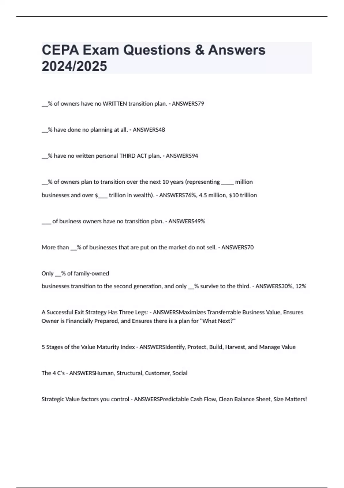 CEPA Exam Questions & Answers 2024/2025 __% of owners have no WRITTEN transition plan. - ANSWERS79 __% have done no planning at all. - ANSWERS48 __% have no written personal THIRD ACT plan. - ANSWERS94 __% of owners plan to transition over the next 10 years (representing ____ million businesses and over $___ trillion in wealth). - ANSWERS76%, 4.5 million, $10 trillion ___ of business owners have no transition plan. - ANSWERS49% More than __% of businesses that are put on the market do not sell. - ANSWERS70 Only __% of family-owned businesses transition to the second generation, and only __% survive to the third. - ANSWERS30%, 12% A Successful Exit Strategy Has Three Legs: - ANSWERSMaximizes Transferrable Business Value, Ensures Owner is Financially Prepared, and Ensures there is a plan for "What Next?" 5 Stages of the Value Maturity Index - ANSWERSIdentify, Protect, Build, Harvest, and Manage Value The 4 C's - ANSWERSHuman, Structural, Customer, Social Strategic Value factors you control - ANSWERSPredictable Cash Flow, Clean Balance Sheet, Size Matters!