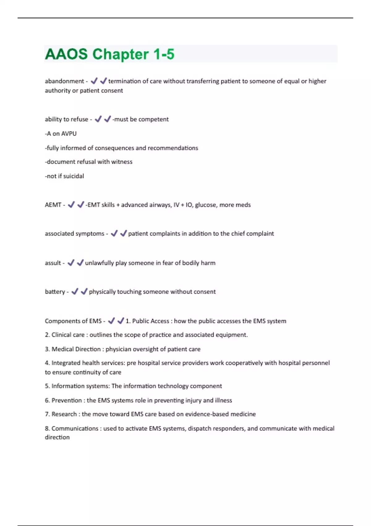 abandonment - termination of care without transferring patient to someone of equal or higher authority or patient consent ability to refuse - -must be competent -A on AVPU -fully informed of consequences and recommendations -document refusal with witness -not if suicidal AEMT - -EMT skills + advanced airways, IV + IO, glucose, more meds associated symptoms - patient complaints in addition to the chief complaint assult - unlawfully play someone in fear of bodily harm battery - physically touching someone without consent Components of EMS - 1. Public Access : how the public accesses the EMS system 2. Clinical care : outlines the scope of practice and associated equipment. 3. Medical Direction : physician oversight of patient care 4. Integrated health services: pre hospital service providers work cooperatively with hospital personnel to ensure continuity of care 5. Information systems: The information technology component 6. Prevention : the EMS systems role in preventing injury and illness 7. Research : the move toward EMS care based on evidence-based medicine 8. Communications : used to activate EMS systems, dispatch responders, and communicate with medical direction9. Human resources : Attempts to professionalize EMS occupations 10.Legislation and regulation: ensures the EMS conforms to varies local, state and federal requirements. 11.Evaluation: the quality improvement component of the EMS system 12. Finance: addresses the funding sources of the EMS system 13. Public education: focuses on the EMS system's role in larger public health system 14. Education system: quality of EMS training confidentiality - - Ems providers cannot release confidential patient information without written consent UNLESS: 1) Information is necessary for continuity of care 2) Information is necessary to facilitate billing for services 3) EMT has received a valid subpoena 4) Reporting possible crimes, abuse, assault, neglect, certain injuries, or communicable diseases Critical Incident Stress Management (CISM) - process to help reduce stress of critical incident -defusing session (within 4 hours) -debriefing session (24-72 hours after) Critical patient - -anxiety, pain/fear, depression, dependency, guilt, mental health issues defamtion - communication of false information that damages the person definite signs of death - -decantation -dependent lividity (blood pooling) -rigor mortis (stiffening of body) -decomposition directional terms - -Right/ left (patients)-Superior (near head) -inferior (near feet) -proximal (closer to trunk) -distal (farther from trunk) -lateral (outer) -medial (closer to midline) -superficial (close to skin) -deep (far from skin) -ventral/ anterior (belly side or front) -dorsal/ posterior (spine side or back) -palmar (palm) -plantar (foot) -apex (tip of structure) duty to act - responsibility to provide care -treatment begins or on call EMR - -emergency medical responder -basic, immediate care; bleeding control, CPR, AED, childbirth
