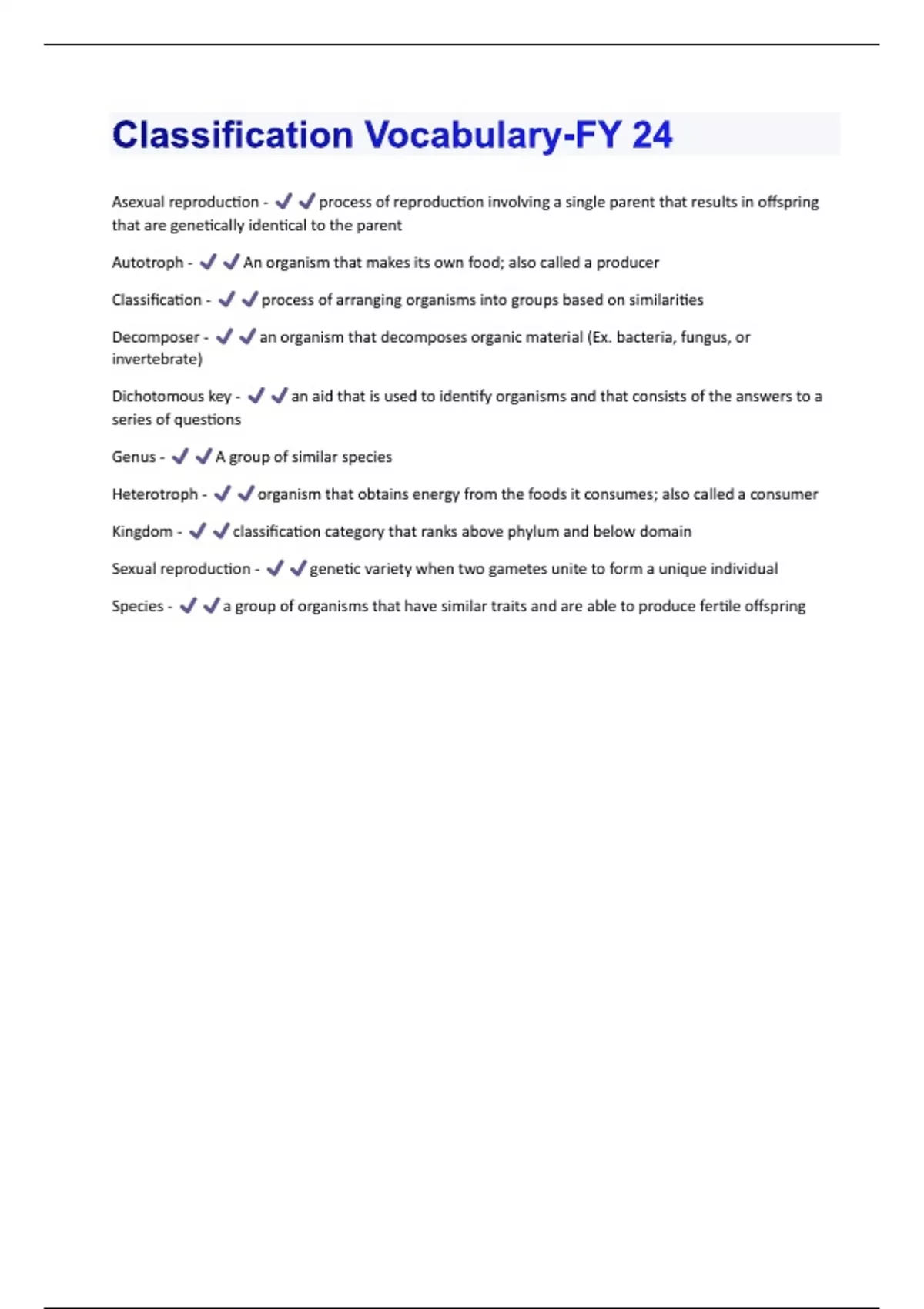 Asexual reproduction - process of reproduction involving a single parent that results in offspring that are genetically identical to the parent Autotroph - An organism that makes its own food; also called a producer Classification - process of arranging organisms into groups based on similarities Decomposer - an organism that decomposes organic material (Ex. bacteria, fungus, or invertebrate) Dichotomous key - an aid that is used to identify organisms and that consists of the answers to a series of questions Genus - A group of similar species Heterotroph - organism that obtains energy from the foods it consumes; also called a consumer Kingdom - classification category that ranks above phylum and below domain Sexual reproduction - genetic variety when two gametes unite to form a unique individual Species - a group of organisms that have similar traits and are able to produce fertile offspring