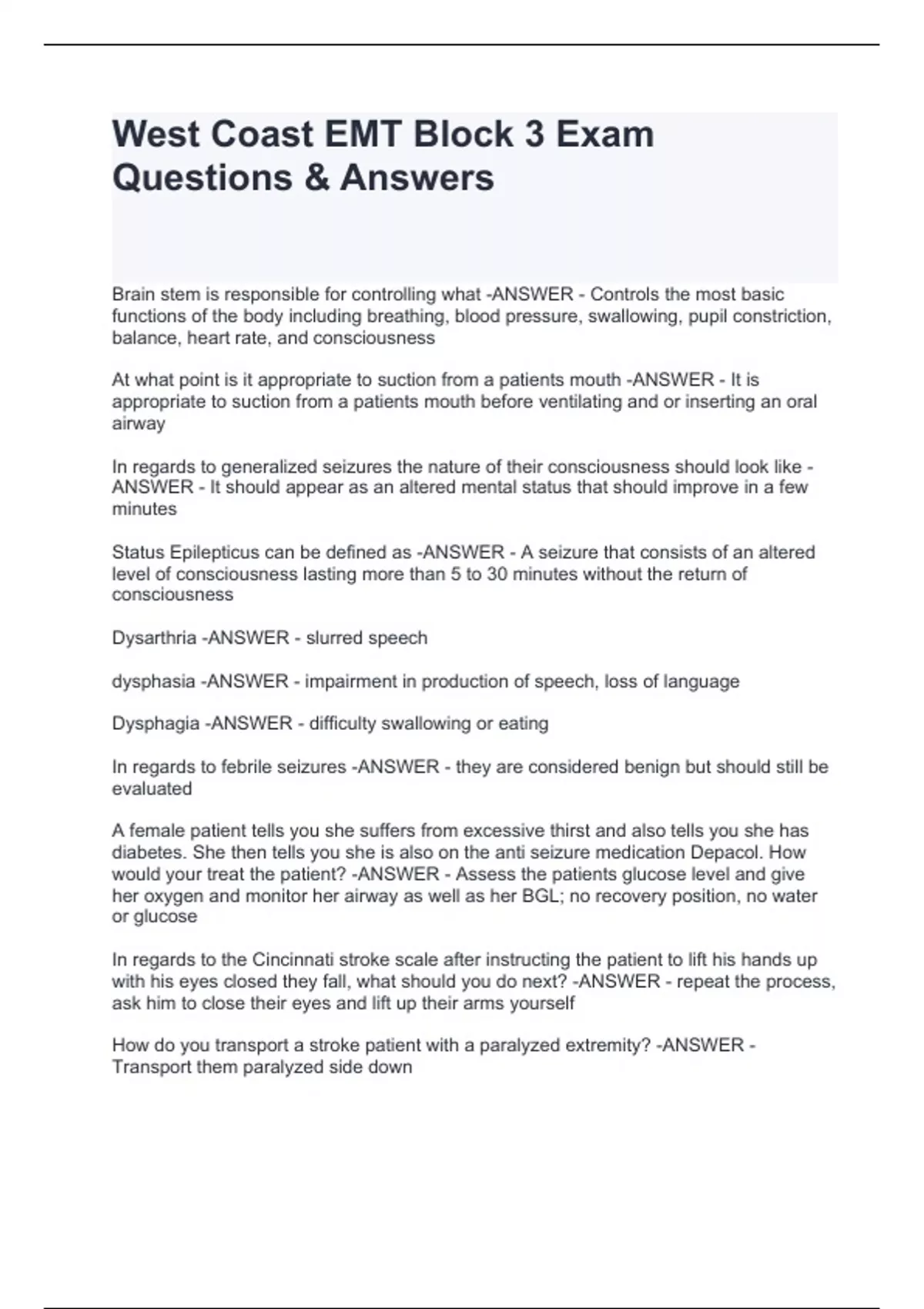 Brain stem is responsible for controlling what -ANSWER - Controls the most basic functions of the body including breathing, blood pressure, swallowing, pupil constriction, balance, heart rate, and consciousness At what point is it appropriate to suction from a patients mouth -ANSWER - It is appropriate to suction from a patients mouth before ventilating and or inserting an oral airway In regards to generalized seizures the nature of their consciousness should look like -ANSWER - It should appear as an altered mental status that should improve in a few minutes Status Epilepticus can be defined as -ANSWER - A seizure that consists of an altered level of consciousness lasting more than 5 to 30 minutes without the return of consciousness Dysarthria -ANSWER - slurred speech dysphasia -ANSWER - impairment in production of speech, loss of language Dysphagia -ANSWER - difficulty swallowing or eating In regards to febrile seizures -ANSWER - they are considered benign but should still be evaluated A female patient tells you she suffers from excessive thirst and also tells you she has diabetes. She then tells you she is also on the anti seizure medication Depacol. How would your treat the patient? -ANSWER - Assess the patients glucose level and give her oxygen and monitor her airway as well as her BGL; no recovery position, no water or glucose In regards to the Cincinnati stroke scale after instructing the patient to lift his hands up with his eyes closed they fall, what should you do next? -ANSWER - repeat the process, ask him to close their eyes and lift up their arms yourself How do you transport a stroke patient with a paralyzed extremity? -ANSWER - Transport them paralyzed side down Does the spleen digest? -ANSWER - No; the stomach and pancreas create enzymes to digest How do the kidneys regulate BP by using sodium? -ANSWER - If the BP is too high, then the kidneys release sodium; if the BP is too low then the kidneys keep the sodium What wraps around the organs of the abdomen -ANSWER - Visceral peritoneum; known as the inner layer What does the parietal peritoneum line? -ANSWER - Surrounds the abdomen and pelvis; known as the outer layer Pain in visceral is describes as -ANSWER - Broad and not easily pinpointed; not local Peptic ulcer disease (PUD) signs and symptoms -ANSWER - consist of burping, pain in the upper abdomen (can be found below the sternum) and subsides after you eat Renal failure is caused by -ANSWER - Hypertension and hyperglycemia what types of hernias are there -ANSWER - reducible, incarcerated and strangulated Reducible hernia -ANSWER - can be pushed back into the abdomen incarcerated hernia -ANSWER - cannot be pushed back into the abdomen Strangulated hernia -ANSWER - when it is incarcerated with a compromised/ cut off blood supply A patient who reports a tearing pain on their lower back is showing signs of most likely a(n) -ANSWER - AAA abdominal aortic aneurysm When palpitating a patients abdomen -ANSWER - do it clockwise and begin with the quadrant on the right of the pain Kussmaul respirations occur -ANSWER - From hyperglycemia