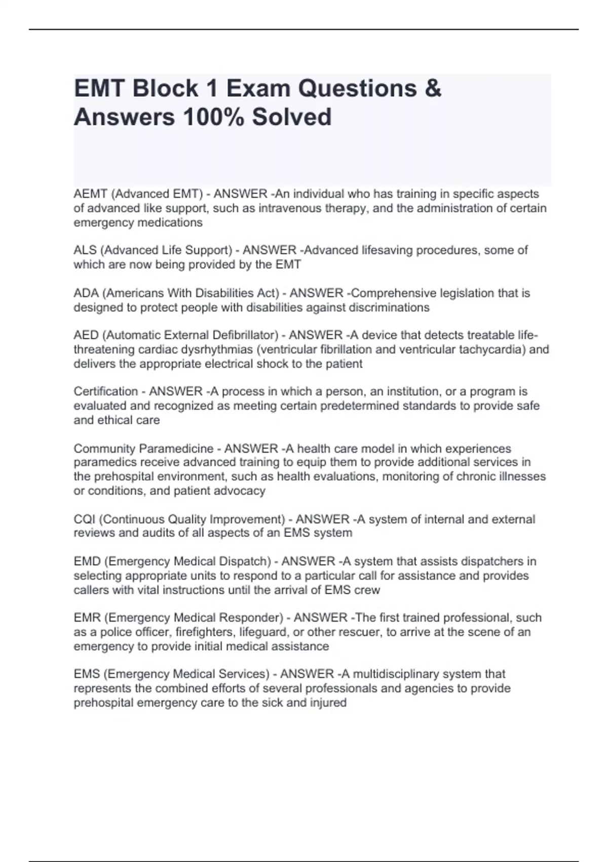 AEMT (Advanced EMT) - ANSWER -An individual who has training in specific aspects of advanced like support, such as intravenous therapy, and the administration of certain emergency medications ALS (Advanced Life Support) - ANSWER -Advanced lifesaving procedures, some of which are now being provided by the EMT ADA (Americans With Disabilities Act) - ANSWER -Comprehensive legislation that is designed to protect people with disabilities against discriminations AED (Automatic External Defibrillator) - ANSWER -A device that detects treatable life-threatening cardiac dysrhythmias (ventricular fibrillation and ventricular tachycardia) and delivers the appropriate electrical shock to the patient Certification - ANSWER -A process in which a person, an institution, or a program is evaluated and recognized as meeting certain predetermined standards to provide safe and ethical care Community Paramedicine - ANSWER -A health care model in which experiences paramedics receive advanced training to equip them to provide additional services in the prehospital environment, such as health evaluations, monitoring of chronic illnesses or conditions, and patient advocacy CQI (Continuous Quality Improvement) - ANSWER -A system of internal and external reviews and audits of all aspects of an EMS system EMD (Emergency Medical Dispatch) - ANSWER -A system that assists dispatchers in selecting appropriate units to respond to a particular call for assistance and provides callers with vital instructions until the arrival of EMS crew EMR (Emergency Medical Responder) - ANSWER -The first trained professional, such as a police officer, firefighters, lifeguard, or other rescuer, to arrive at the scene of an emergency to provide initial medical assistance EMS (Emergency Medical Services) - ANSWER -A multidisciplinary system that represents the combined efforts of several professionals and agencies to provide prehospital emergency care to the sick and injured EMT (Emergency Medical Technician) - ANSWER -An individual who has training in basic life support, including automated external defibrillation, use of a definitive airway adjunct, and assisting patients with certain medications HIPAA (Health Insurance Portability and Accountability Act) - ANSWER -Federal legislation passed in 1996. Its main effect in EMS is in limiting availability of patients' health care information and penalizing violations of patient privacy Intravenous (IV) Therapy - ANSWER -The delivery of medication directly into a vein Licensure - ANSWER -The process whereby a competent authority, usually the state, allows people to perform a regulated act Medical Control - ANSWER -Physician instructions given directly by radio or cell phone (online/direct) or indirectly by protocol/guidelines (off-line/indirect), as authorized by the medical direction of the service program Medical Director - ANSWER -The physician who authorizes or delegates to the EMT the authority to provide medical care in the field MIH (Mobile Integrated Healthcare) - ANSWER -A method of delivering health care which involves providing health care within the community rather than at a physician's office or hospital National EMS Scope of Practice Model - ANSWER -A document created by the National Highway Traffic Safety