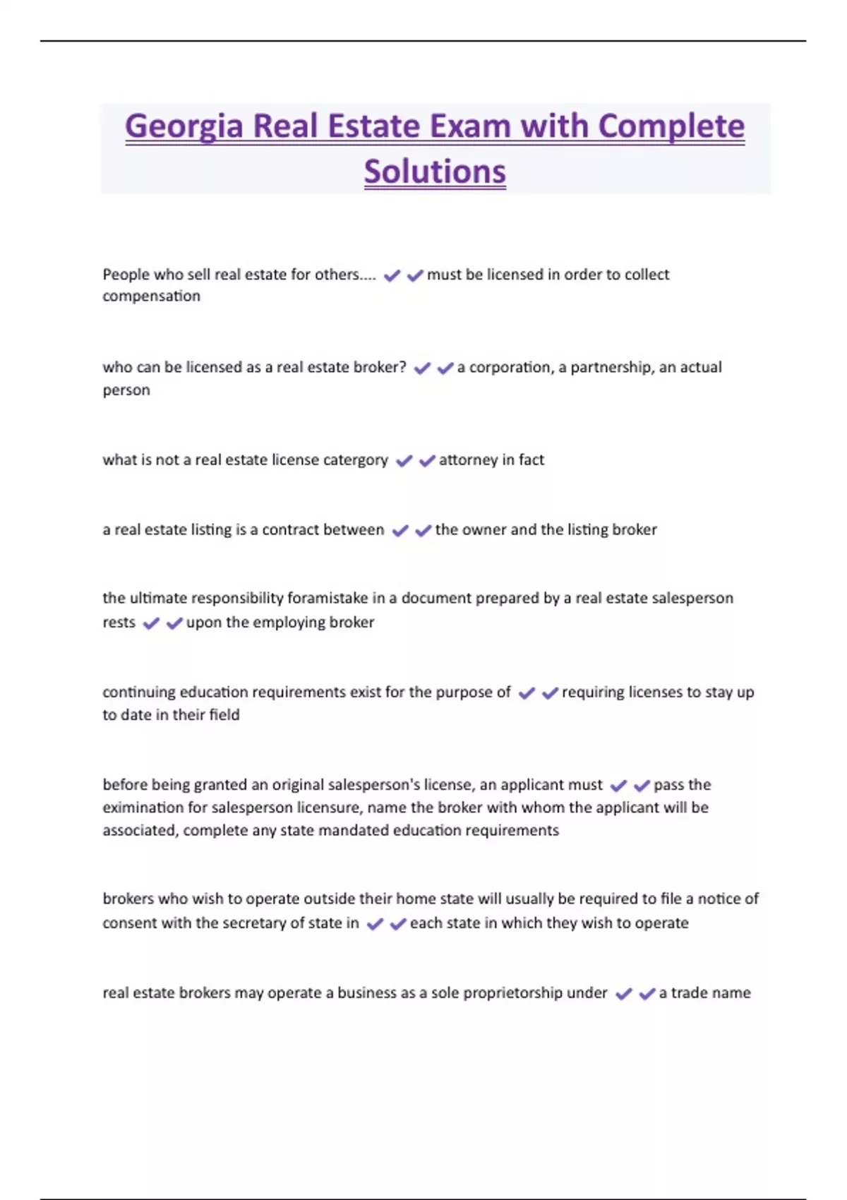 Georgia Real Estate Exam with Complete Solutions People who sell real estate for others.... must be licensed in order to collect compensation who can be licensed as a real estate broker? a corporation, a partnership, an actual person what is not a real estate license catergory attorney in fact a real estate listing is a contract between the owner and the listing broker the ultimate responsibility foramistake in a document prepared by a real estate salesperson rests upon the employing broker continuing education requirements exist for the purpose of requiring licenses to stay u