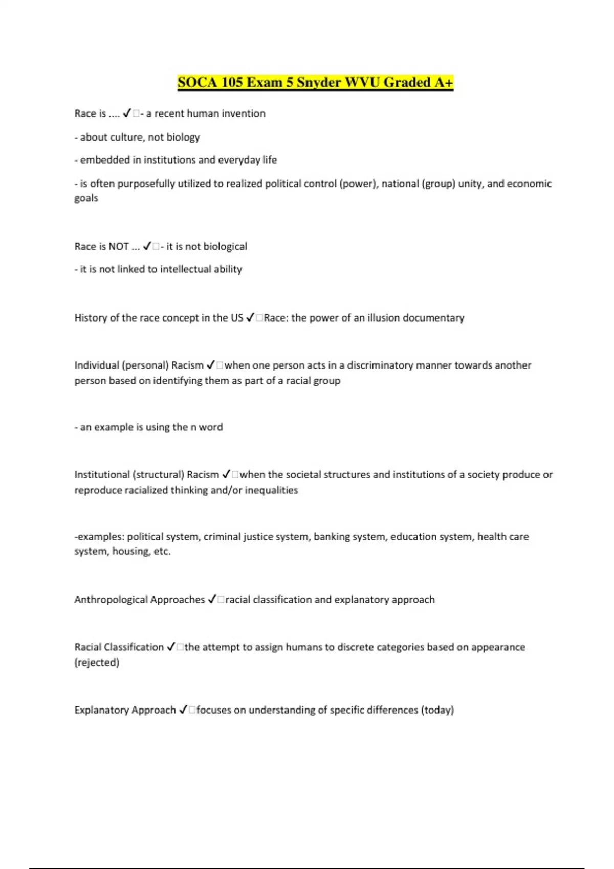 SOCA 105 Exam 5 Snyder WVU Graded A+ Race is .... ️- a recent human invention - about culture, not biology - embedded in institutions and everyday life - is often purposefully utilized to realized political control (power), national (group) unity, and economic goals Race is NOT ... ️- it is not biological - it is not linked to intellectual ability History of the race concept in the US ️Race: the power of an illusion documentary Individual (personal) Racism ️when one person acts in a discriminatory manner towards another person based on identifying them as part of a racial group - an example is using the n word Institutional (structural) Racism ️when the societal structures and institutions of a society produce or reproduce racialized thinking and/or inequalities -examples: political system, criminal justice system, banking system, education system, health care system, housing, etc. Anthropological Approaches ️racial classification and explanatory approach Racial Classification ️the attempt to assign humans to discrete categories based on appearance (rejected) Explanatory Approach ️focuses on understanding of specific differences (today) Biological Race ️refers to geographically isolated subdivision of a species - race as a biological category is supposed to reflect inherited/shared genetic material - race does not apply to human populations - human biological variation distributed gradually between populations called clines Tripartite Scheme ️one the first schemes; three great races: yellow, black, white -"color-based" racial labels are not accurate -many populations don't fit neatly into any one of the three "great races" -no single trait can be used as a basis for racial classification -phenotypical similarities and differences do not necessarily have genetic basis Natural Selection ️process by which nature selects the forms most fit to survive and reproduce in a given environment Melanin ️-primary determinant of human skin color -chemical substance manufactured in the epidermis -prior to 16th century, darker skinned populations closest to the equator -"natural sunscreen" produced by skin cells responsible for pirmentation