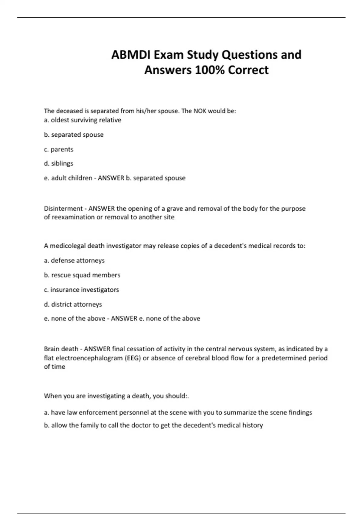 The deceased is separated from his/her spouse. The NOK would be: a. oldest surviving relative b. separated spouse c. parents d. siblings e. adult children - ANSWER b. separated spouse Disinterment - ANSWER the opening of a grave and removal of the body for the purpose of reexamination or removal to another site