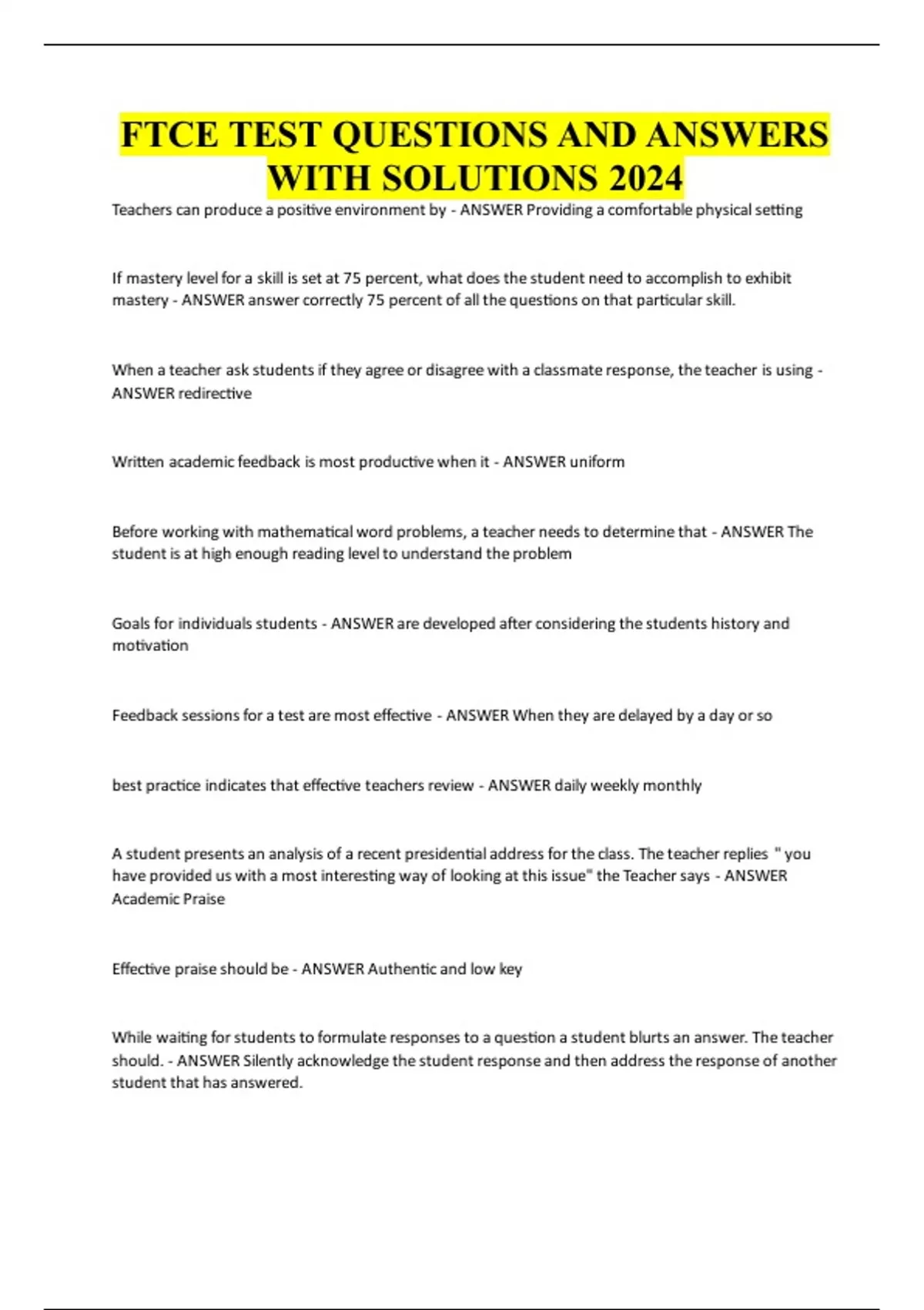 FTCE TEST QUESTIONS AND ANSWERS WITH SOLUTIONS 2024