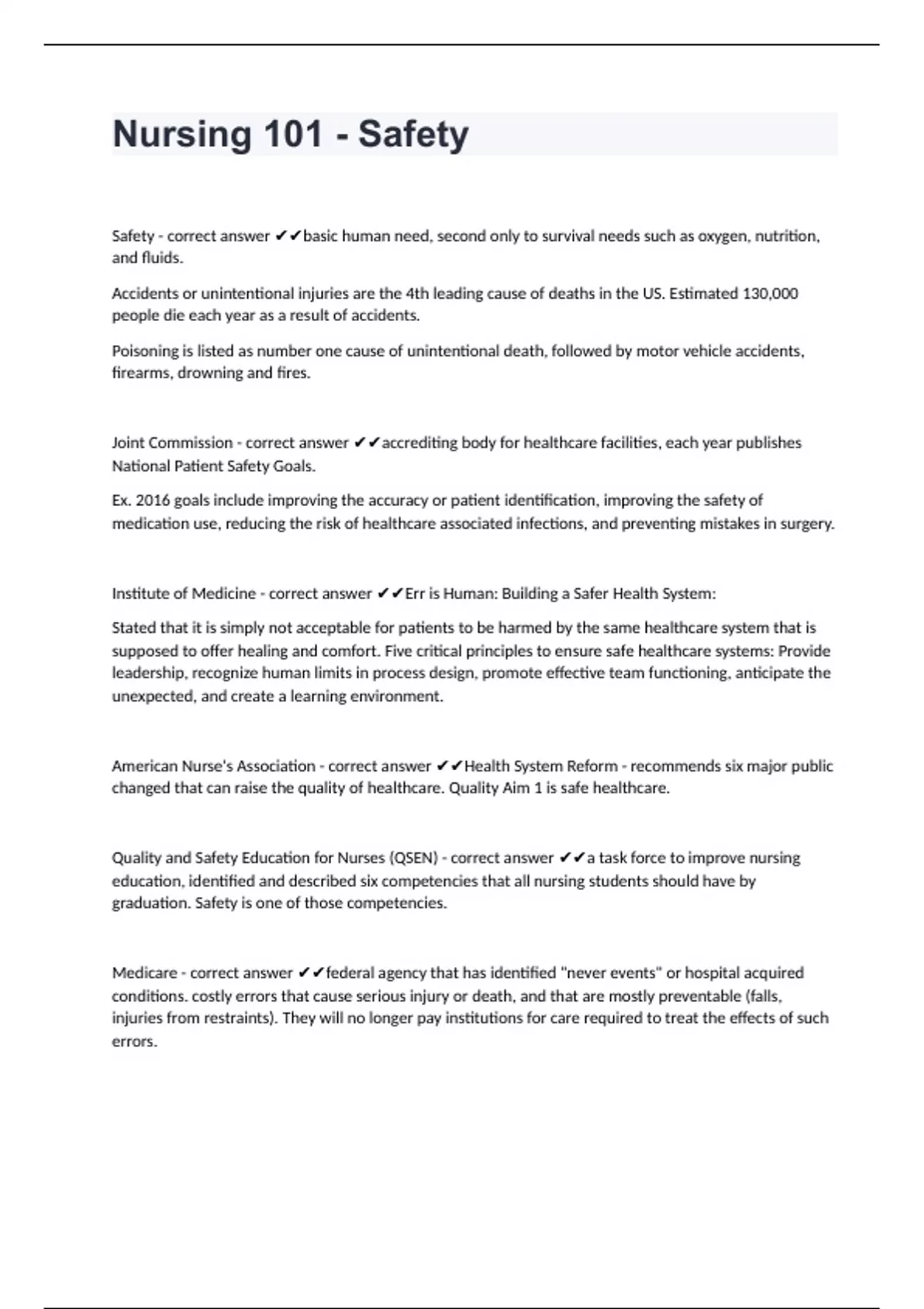Nursing 101 - SafetySafety - correct answer basic human need, second only to survival needs such as oxygen, nutrition, and fluids. Accidents or unintentional injuries are the 4th leading cause of deaths in the US. Estimated 130,000 people die each year as a result of accidents. Poisoning is listed as number one cause of unintentional death, followed by motor vehicle accidents, firearms, drowning and fires. Joint Commission - correct answer accrediting body for healthcare facilities, each year publishes National Patient Safety Goals. Ex. 2016 goals include improving the accuracy or patient identification, improving the safety of medication use, reducing the risk of healthcare associated infections, and preventing mistakes in surgery. Institute of Medicine - correct answer Err is Human: Building a Safer Health System: Stated that it is simply not acceptable for patients to be harmed by the same healthcare system that is supposed to offer healing and comfort. Five critical principles to ensure safe healthcare systems: Provide leadership, recognize human limits in process design, promote effective team functioning, anticipate the unexpected, and create a learning environment. American Nurse's Association - correct answer Health System Reform - recommends six major public changed that can raise the quality of healthcare. Quality Aim 1 is safe healthcare. Quality and Safety Education for Nurses (QSEN) - correct answer a task force to improve nursing education, identified and described six competencies that all nursing students should have by graduation. Safety is one of those competencies. Medicare - correct answer federal agency that has identified "never events" or hospital acquired conditions. costly errors that cause serious injury or death, and that are mostly preventable (falls, injuries from restraints). They will no longer pay institutions for care required to treat the effects of such errors.