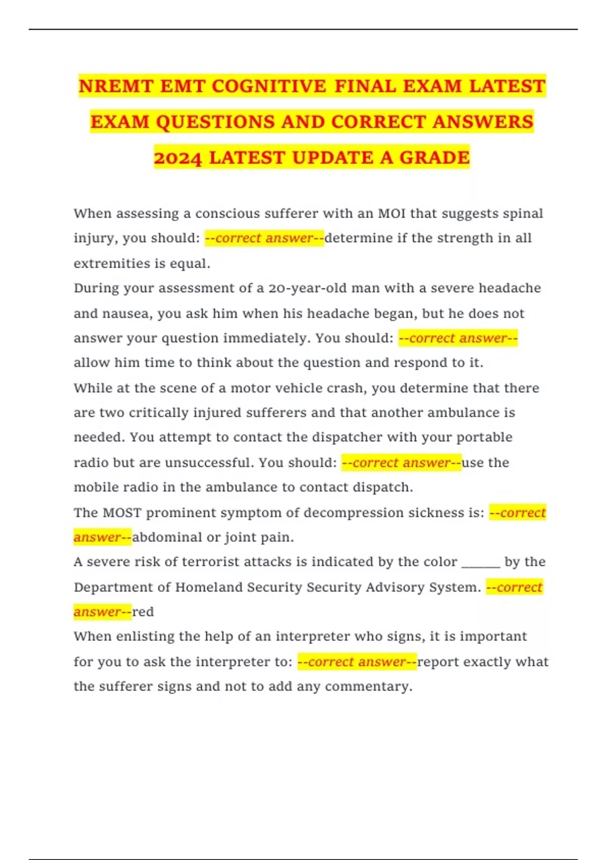NREMT EMT COGNITIVE FINAL EXAM LATEST EXAM QUESTIONS AND CORRECT ANSWERS 2024 LATEST UPDATE A GRADE