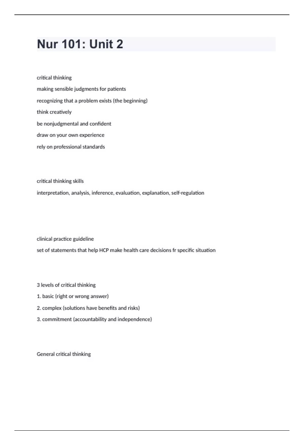 Nur 101: Unit 2 critical thinking making sensible judgments for patients recognizing that a problem exists (the beginning) think creatively be nonjudgmental and confident draw on your own experience rely on professional standards critical thinking skills interpretation, analysis, inference, evaluation, explanation, self-regulation clinical practice guideline set of statements that help HCP make health care decisions fr specific situation 3 levels of critical thinking 1. basic (right or wrong answer) 2. complex (solutions have benefits and risks) 3. commitment (accountability and independence) General critical thinking