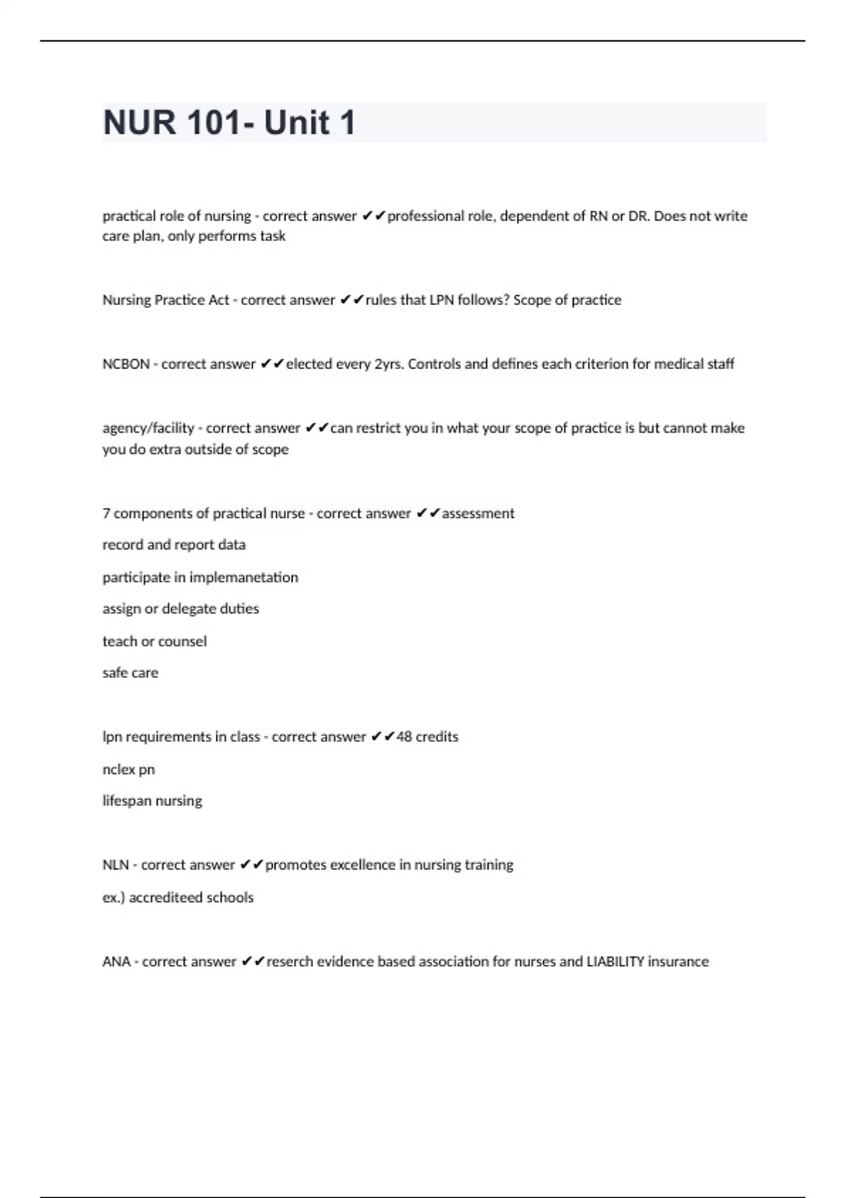 NUR 101- Unit 1 practical role of nursing - correct answer professional role, dependent of RN or DR. Does not write care plan, only performs task Nursing Practice Act - correct answer rules that LPN follows? Scope of practice NCBON - correct answer elected every 2yrs. Controls and defines each criterion for medical staff agency/facility - correct answer can restrict you in what your scope of practice is but cannot make you do extra outside of scope 7 components of practical nurse - correct answer assessment record and report data participate in implemanetation assign or delegate duties teach or counsel safe care lpn requirements in class - correct answer 48 credits nclex pn lifespan nursing