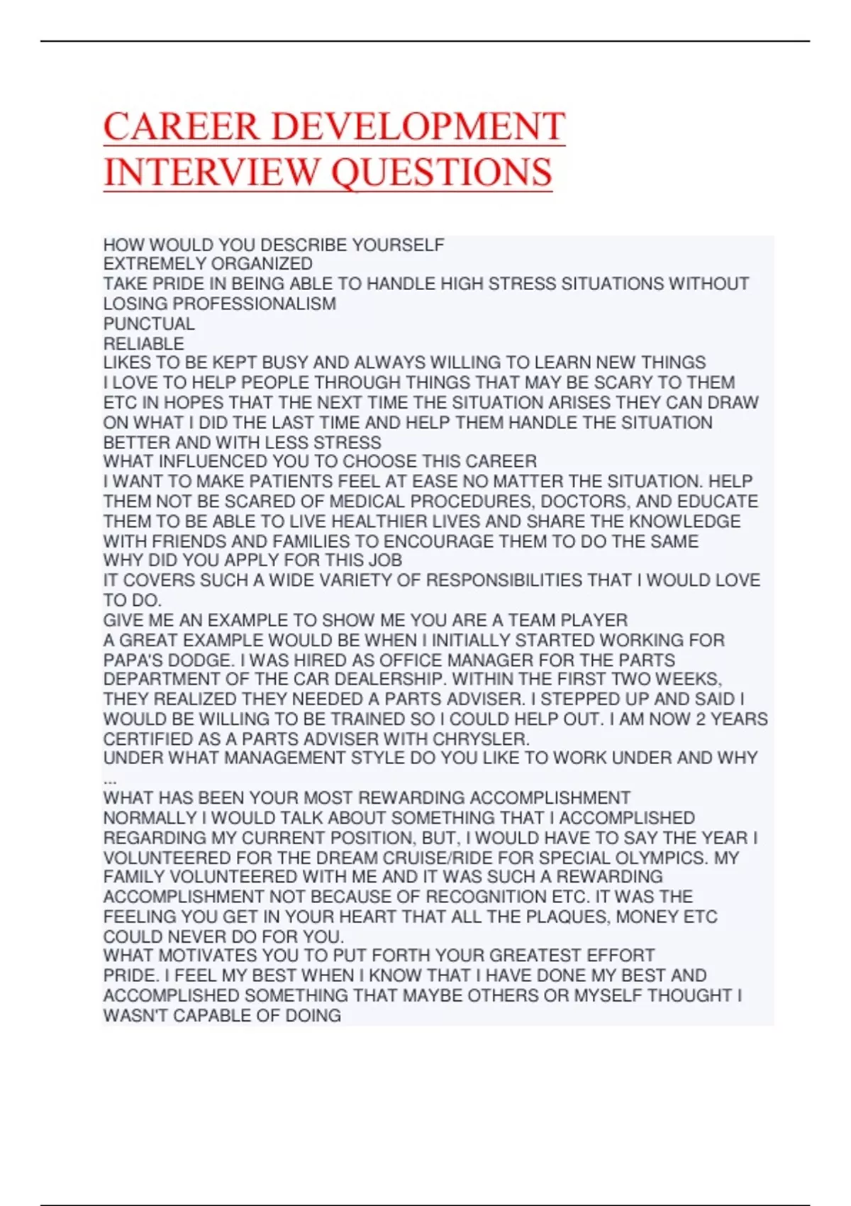 HOW WOULD YOU DESCRIBE YOURSELF EXTREMELY ORGANIZED TAKE PRIDE IN BEING ABLE TO HANDLE HIGH STRESS SITUATIONS WITHOUT LOSING PROFESSIONALISM PUNCTUAL RELIABLE LIKES TO BE KEPT BUSY AND ALWAYS WILLING TO LEARN NEW THINGS I LOVE TO HELP PEOPLE THROUGH THINGS THAT MAY BE SCARY TO THEM ETC IN HOPES THAT THE NEXT TIME THE SITUATION ARISES THEY CAN DRAW ON WHAT I DID THE LAST TIME AND HELP THEM HANDLE THE SITUATION BETTER AND WITH LESS STRESS WHAT INFLUENCED YOU TO CHOOSE THIS CAREER I WANT TO MAKE PATIENTS FEEL AT EASE NO MATTER THE SITUATION. HELP THEM NOT BE SCARED OF MEDICAL PROCEDURES, DOCTORS, AND EDUCATE THEM TO BE ABLE TO LIVE HEALTHIER LIVES AND SHARE THE KNOWLEDGE WITH FRIENDS AND FAMILIES TO ENCOURAGE THEM TO DO THE SAME WHY DID YOU APPLY FOR THIS JOB