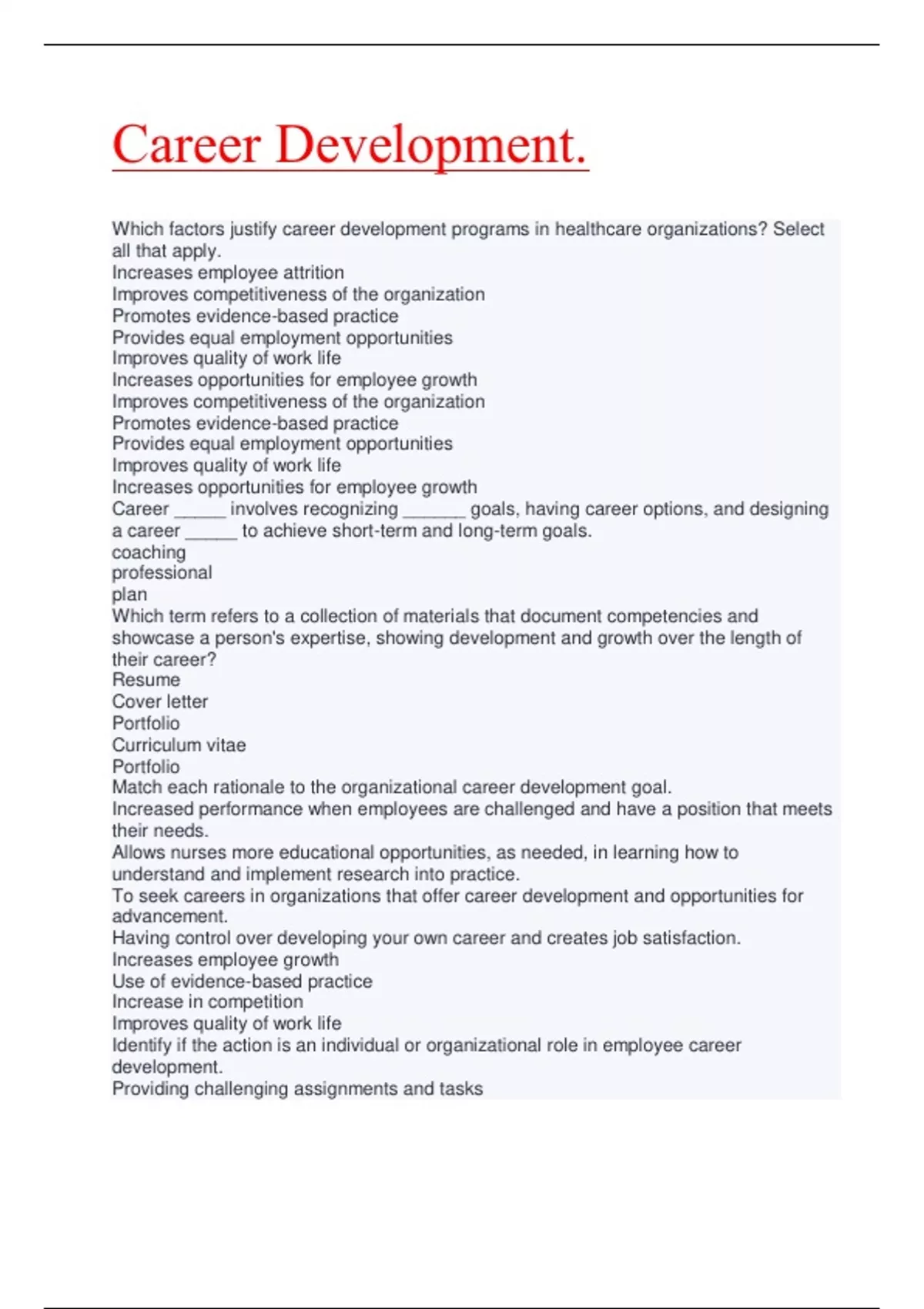 Increases opportunities for employee growth Career _____ involves recognizing ______ goals, having career options, and designing a career _____ to achieve short-term and long-term goals. coaching professional plan Which term refers to a collection of materials that document competencies and showcase a person's expertise, showing development and growth over the length of their career? Resume Cover letter Portfolio Curriculum vitae Portfolio Match each rationale to the organizational career development goal. Increased performance when employees are challenged and have a position that meets their needs. Allows nurses more educational opportunities, as needed, in learning how to understand and implement research into practice. To seek careers in organizations that offer career development and opportunities for advancement. Having control over developing your own career and creates job satisfaction. Increases employee growth Use of evidence-based practice Increase in competition Improves quality of work life Identify if the action is an individual or organizational role in employee career development. Providing challenging assignments and tasks