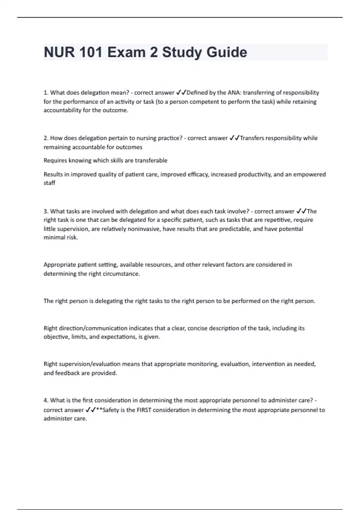 NUR 101 Exam 2 Study Guide1. What does delegation mean? - correct answer Defined by the ANA: transferring of responsibility for the performance of an activity or task (to a person competent to perform the task) while retaining accountability for the outcome. 2. How does delegation pertain to nursing practice? - correct answer Transfers responsibility while remaining accountable for outcomes Requires knowing which skills are transferable Results in improved quality of patient care, improved efficacy, increased productivity, and an empowered staff 3. What tasks are involved with delegation and what does each task involve? - correct answer The right task is one that can be delegated for a specific patient, such as tasks that are repetitive, require little supervision, are relatively noninvasive, have results that are predictable, and have potential minimal risk. Appropriate patient setting, available resources, and other relevant factors are considered in determining the right circumstance. The right person is delegating the right tasks to the right person to be performed on the right person. Right direction/communication indicates that a clear, concise description of the task, including its objective, limits, and expectations, is given. Right supervision/evaluation means that appropriate monitoring, evaluation, intervention as needed, and feedback are provided. 4. What is the first consideration in determining the most appropriate personnel to administer care? - correct answer **Safety is the FIRST consideration in determining the most appropriate personnel to administer care.