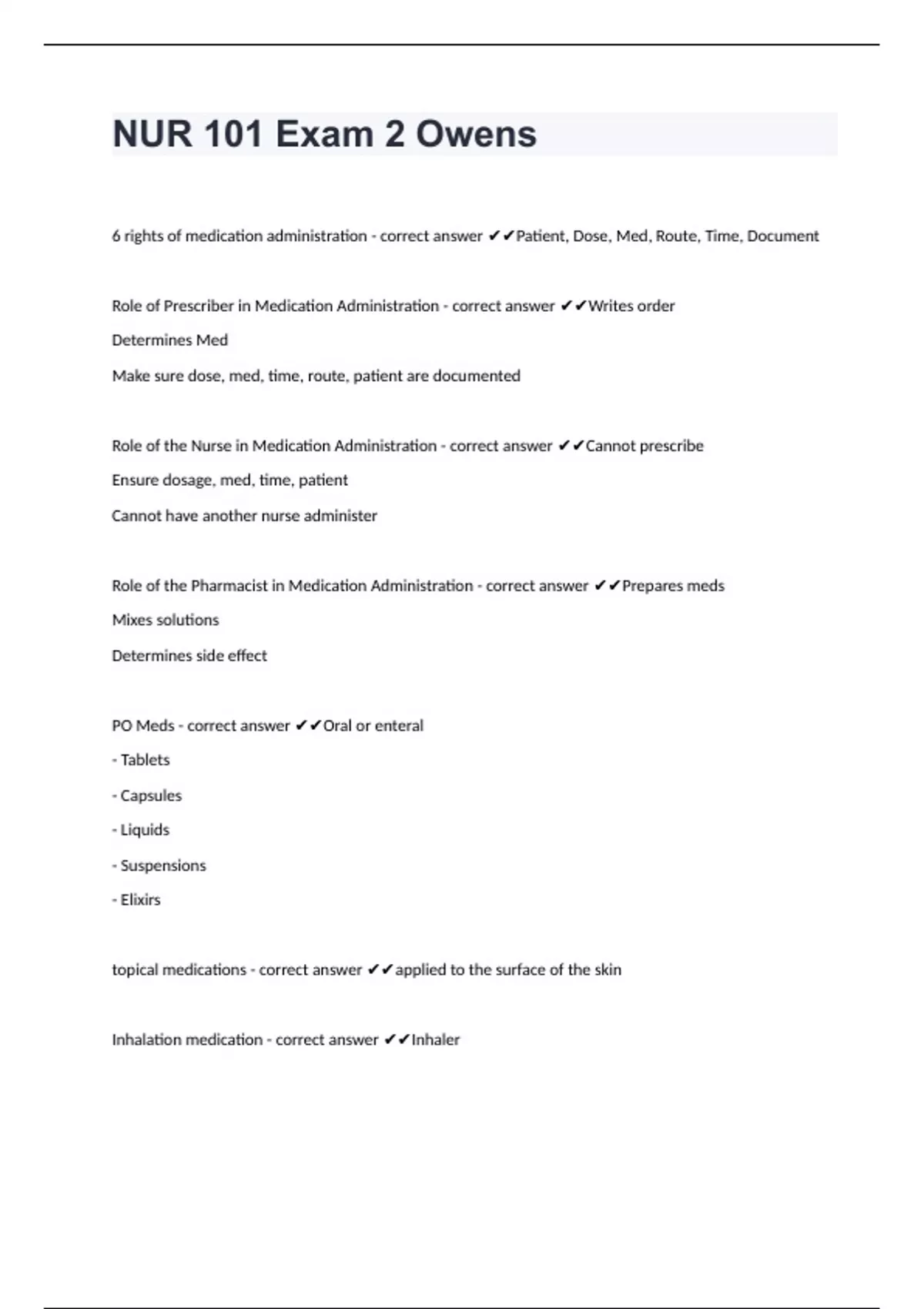NUR 101 Exam 2 Owens6 rights of medication administration - correct answer Patient, Dose, Med, Route, Time, Document Role of Prescriber in Medication Administration - correct answer Writes order Determines Med Make sure dose, med, time, route, patient are documented Role of the Nurse in Medication Administration - correct answer Cannot prescribe Ensure dosage, med, time, patient Cannot have another nurse administer Role of the Pharmacist in Medication Administration - correct answer Prepares meds Mixes solutions Determines side effect PO Meds - correct answer Oral or enteral - Tablets - Capsules - Liquids - Suspensions - Elixirs topical medications - correct answer applied to the surface of the skin
