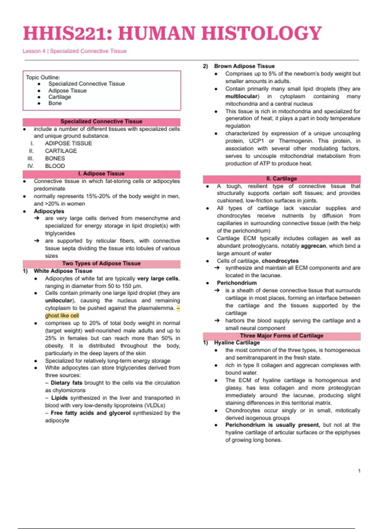 Two Types of Adipose Tissue ● Cells of cartilage, chondrocytes