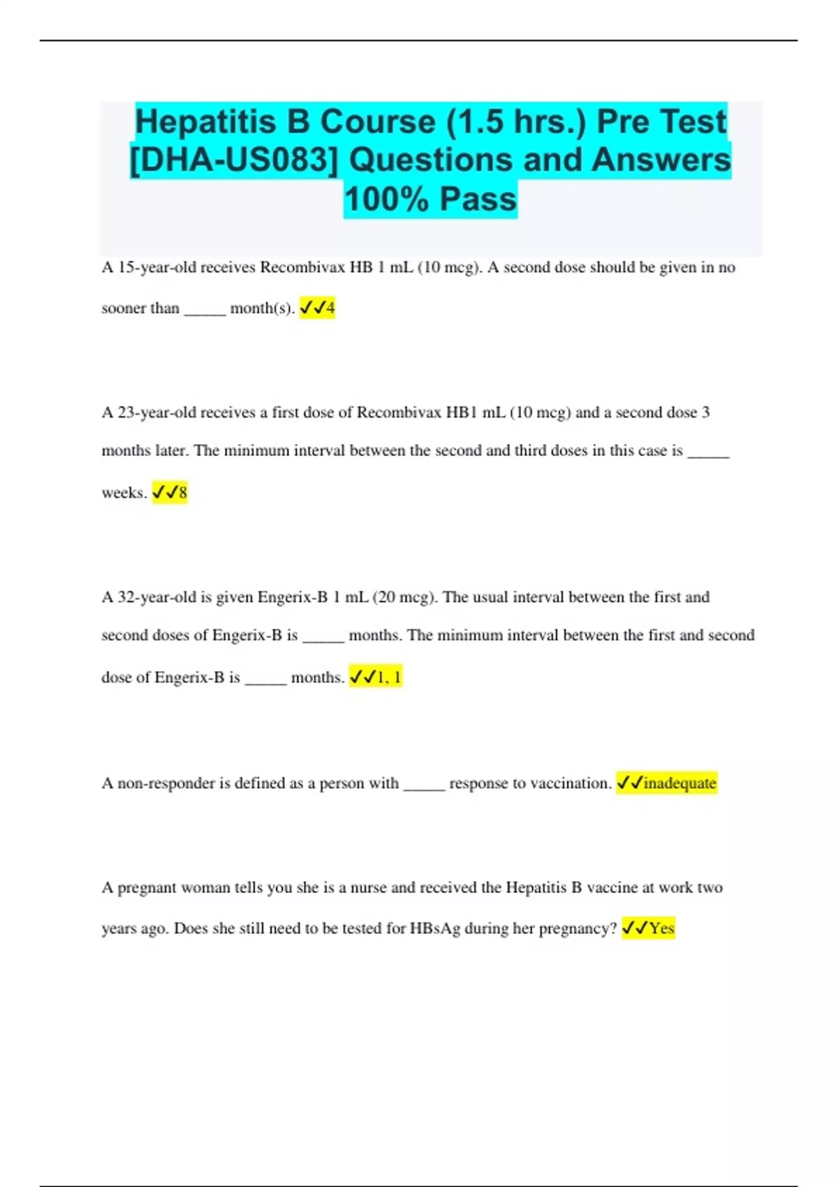 Hepatitis B Course (1.5 hrs.) Pre Test [DHA-US083] Questions and Answers 100% Pass A 15-year-old receives Recombivax HB 1 mL (10 mcg). A second dose should be given in no sooner than _____ month(s). 4 A 23-year-old receives a first dose of Recombivax HB1 mL (10 mcg) and a second dose 3 months later. The minimum interval between the second and third doses in this case is _____ weeks. 8 A 32-year-old is given Engerix-B 1 mL (20 mcg). The usual interval between the first and second doses of Engerix-B is _____ months. The minimum interval between the first and second dose of Engerix-B is _____ months. 1, 1 A non-responder is defined as a person with _____ response to vaccination. inadequate A pregnant woman tells you she is a nurse and received the Hepatitis B vaccine at work two years ago. Does she still need to be tested for HBsAg during her pregnancy? Yes A Servicemember received one dose of Twinrix before deployment to Afghanistan. This person now due for their second dose, but the only vaccines available are single-antigen Hepatitis A and B vaccines. How many doses of single-antigen Hepatitis B vaccine will this person need to complete their primary series for hepatitis B? 2 Fill in the blanks below with the correct dose in micrograms and the number of mL of vaccine for each person described. Recombivax HB for a 15-year-old receiving 2 doses. Dose equals _____ mcg, Number of mL equals _____ mL. 10, 1 Fill in the blanks below with the correct dose in micrograms and the number of mL of vaccine for the person described. Engerix-B for a 19-year-old. Dose equals _____ mcg, Number of mL equals _____ mL. 10, 0.5 Fill in the blanks below with the correct dose in micrograms and the number of mL of vaccine for the person described. Engerix-B for a 5-year-old. Dose equals _____ mcg, Number of mL equals ____ mL. 10, 0.5 Fill in the blanks below with the correct dose in micrograms and the number of mL of vaccine for the person described. Recombivax HB for a 52-year-old. Dose equals _____ mcg, Number of mL equals _____ mL. 10, 1 Fill in the blanks below with the correct dose in microgramsand the number of mL of vaccine for the person described. Engerix-B for a 42-year-old. Dose equals _____ mcg, Number of mL equals ____ mL. 20, 1 Fill in the blanks below with the correct dose in microgramsand the number of mL of vaccine for the person described. Recombivax HB for a 15-year-old receiving 3 doses. Dose equals _____ mcg, Number of mL equals _____ mL. 5, 0.5 Hepatitis B vaccine is recombinant vaccine that contains: Genetically-engineered HBsAg Here are two statements about Hepatitis B vaccine. One is true and the other is false. Select the true statement. Hepatitis B vaccine is administered intramuscularly Here are two statements about Hepatitis B vaccine.