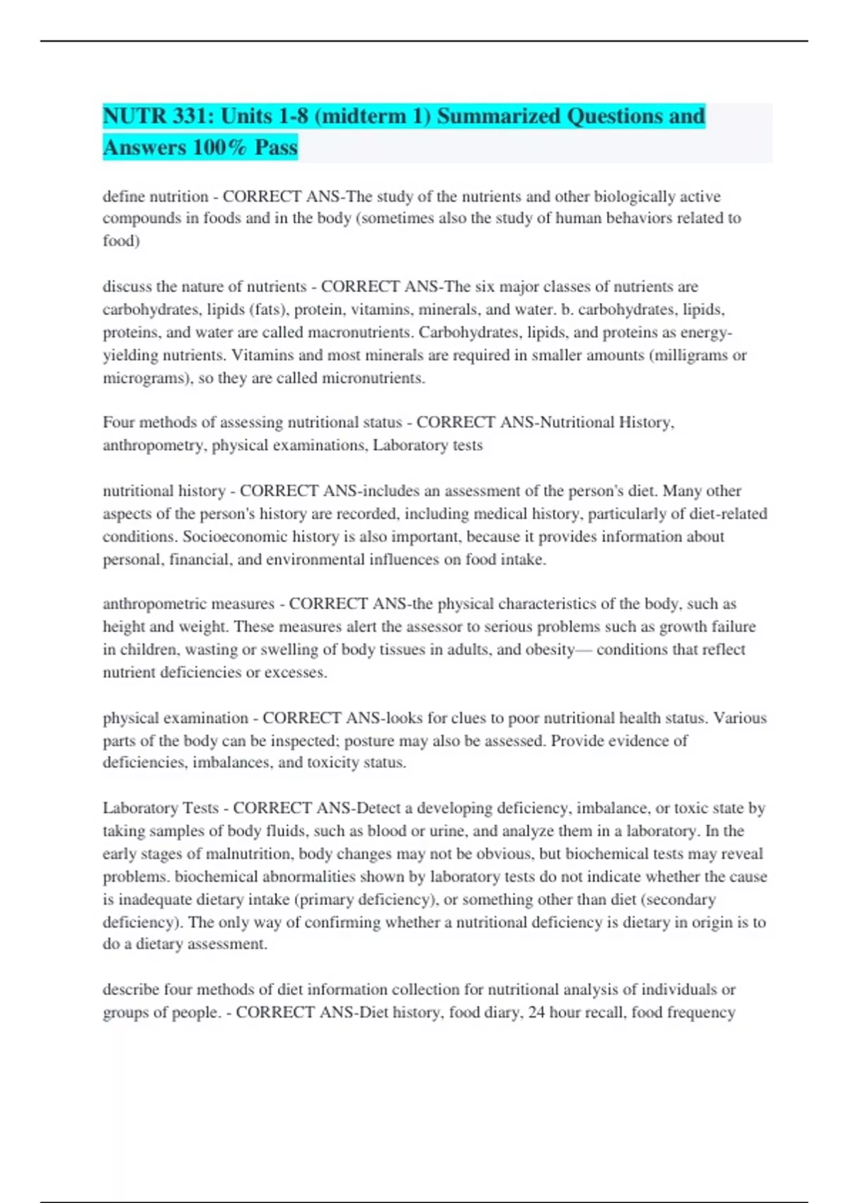 NUTR 331: Units 1-8 (midterm 1) Summarized Questions and Answers 100% Pass