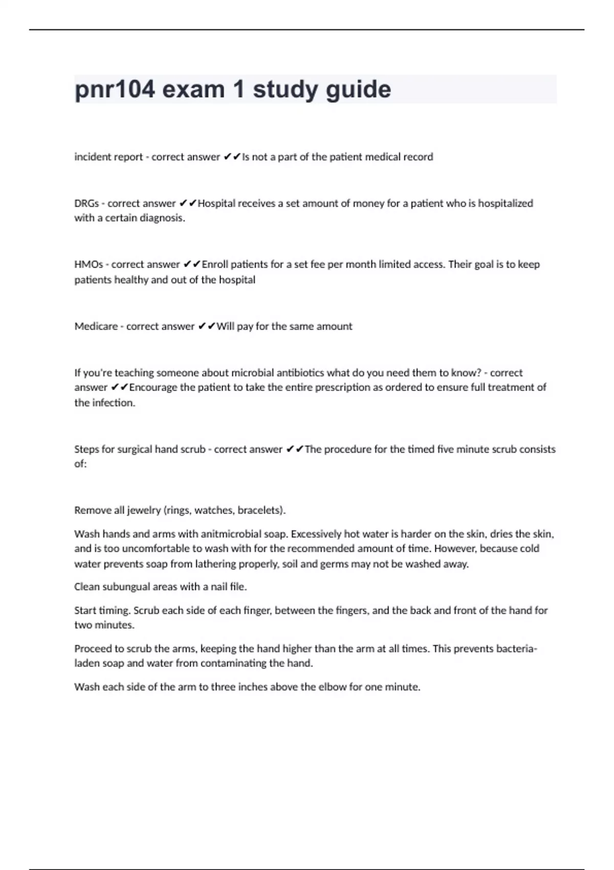 pnr104 exam 1 study guideincident report - correct answer Is not a part of the patient medical record DRGs - correct answer Hospital receives a set amount of money for a patient who is hospitalized with a certain diagnosis. HMOs - correct answer Enroll patients for a set fee per month limited access. Their goal is to keep patients healthy and out of the hospital Medicare - correct answer Will pay for the same amount If you're teaching someone about microbial antibiotics what do you need them to know? - correct answer Encourage the patient to take the entire prescription as ordered to ensure full treatment of the infection. Steps for surgical hand scrub - correct answer The procedure for the timed five minute scrub consists of: Remove all jewelry (rings, watches, bracelets). Wash hands and arms with anitmicrobial soap. Excessively hot water is harder on the skin, dries the skin, and is too uncomfortable to wash with for the recommended amount of time. However, because cold water prevents soap from lathering properly, soil and germs may not be washed away. Clean subungual areas with a nail file. Start timing. Scrub each side of each finger, between the fingers, and the back and front of the hand for two minutes. Proceed to scrub the arms, keeping the hand higher than the arm at all times. This prevents bacteria-laden soap and water from contaminating the hand. Wash each side of the arm to three inches above the elbow for one minute.