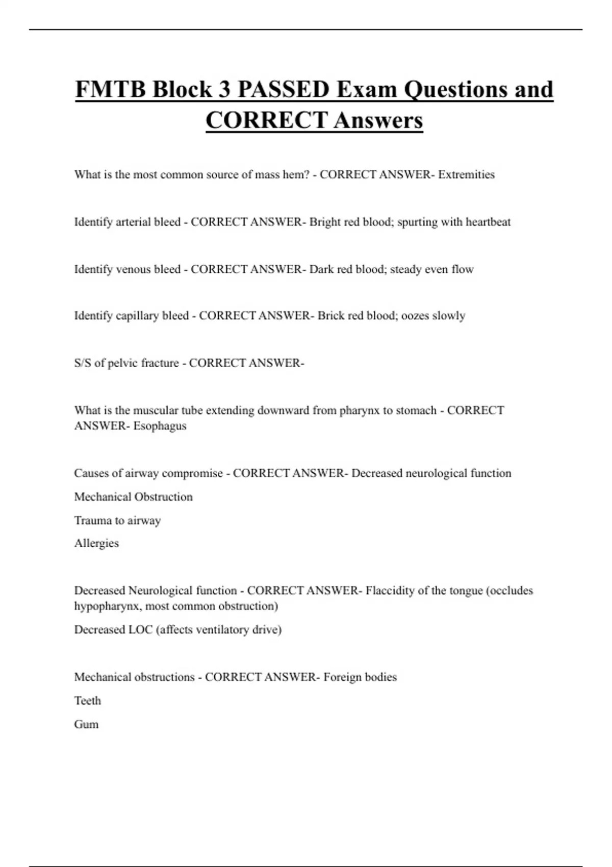 FMTB Block 3 PASSED Exam Questions and CORRECT Answers What is the most common source of mass hem? - CORRECT ANSWER- Extremities Identify arterial bleed - CORRECT ANSWER- Bright red blood; spurting with heartbeat Identify venous bleed - CORRECT ANSWER- Dark red blood; steady even flow Identify capillary bleed - CORRECT ANSWER- Brick red blood; oozes slowly S/S of pelvic fracture - CORRECT ANSWER