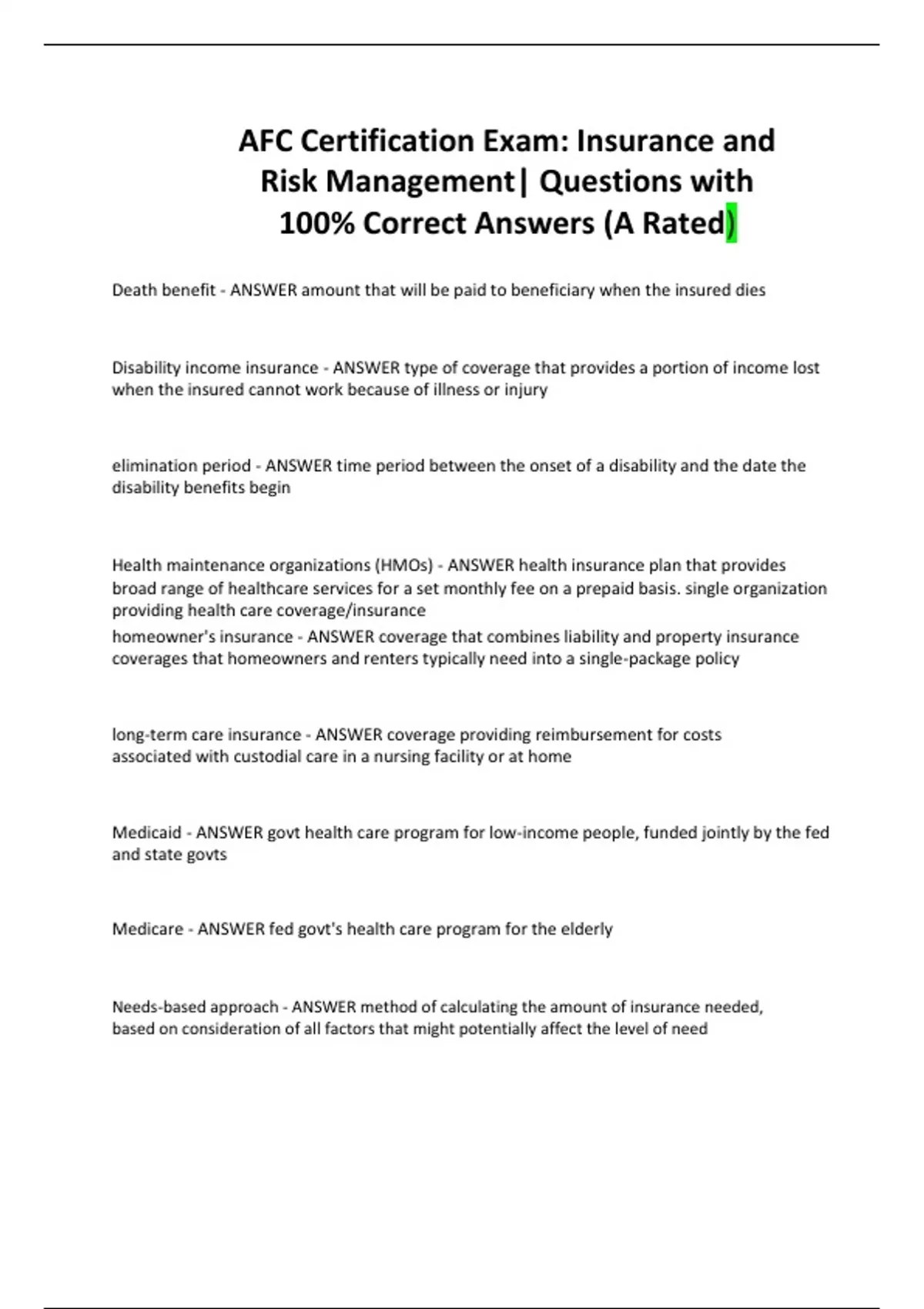 AFC Certification Exam: Insurance and Risk Management| Questions with 100% Correct Answers (A Rated)