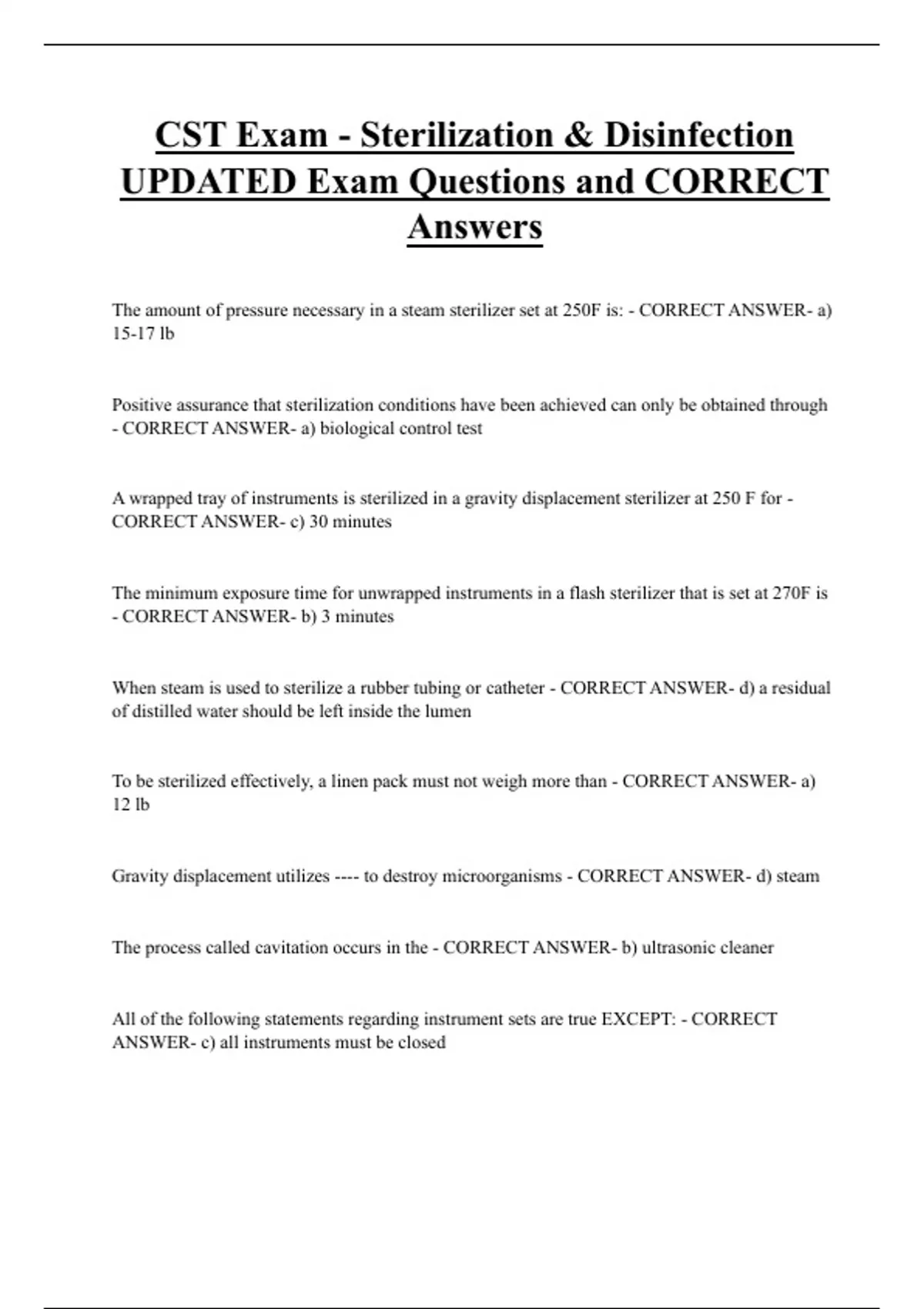 CST Exam - Sterilization & Disinfection UPDATED Exam Questions and CORRECT Answers The amount of pressure necessary in a steam sterilizer set at 250F is: - CORRECT ANSWER- a) 15-17 lb Positive assurance that sterilization conditions have been achieved can only be obtained through - CORRECT ANSWER- a) biological control test A wrapped tray of instruments is sterilized in a gravity displacement sterilizer at 250 F for - CORRECT ANSWER- c) 30 minutes